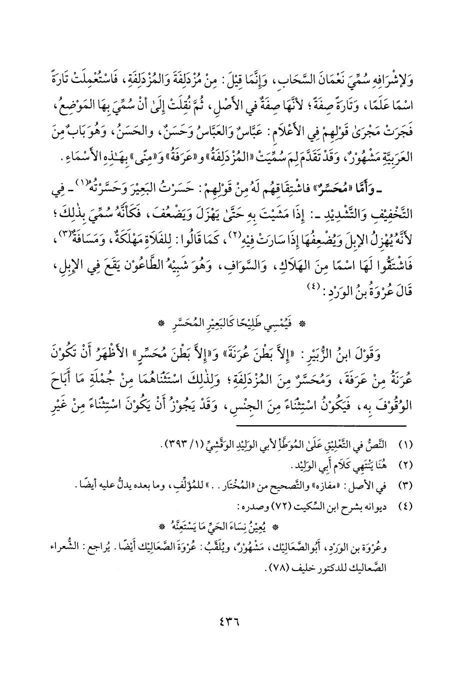 ولإشرافه سمي نعمان السحاب، وإنما قيل: من مزدلفة والمزدلفة، فاستعملت تارة اسماً علماً، وتارة صفة؛ لأنها صفة في الأصل، ثم نقلت إلى أن سمي بها الموضع، فجرت مجرى قولهم في الأعلام: عباس والعباس وحسن، والحسن، وهو باب من العربية مشهور، وقد تقدم لم سميت "المزدلفة" و"عرفة" و"منى" بهذه الأسماء.