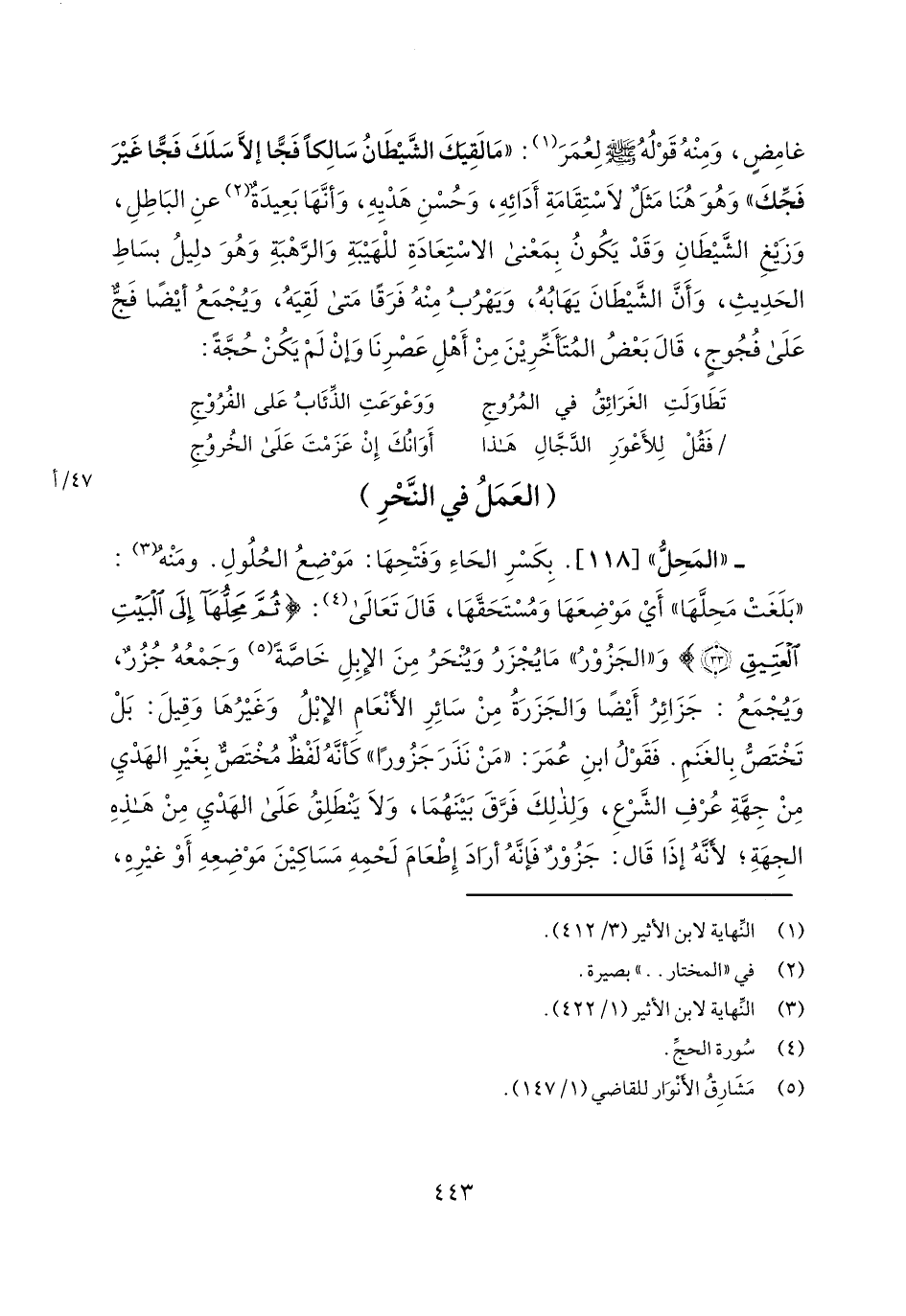 "المحل" [118]. بكسر الحاء وفتحها: موضع الحلول. ومنه: "بلغت محلها" أي موضعها ومستحقها، قال تعالى: {ثُمَّ مَحِلُّهَا إِلَى الْبَيْتِ الْعَتِيقِ (33)} و"الجزور" ما يجزر وينحر من الإبل خاصة وجمعه جزر، ويجمع: جزائر أيضاً والجزرة من سائر الأنعام الإبل وغيرها وقيل: بل تختص بالغنم. فقول ابن عمر: "من نذر جزوراً" كأنه لفظ مختص بغير الهدي من جهة عرف الشرع، ولذلك فرق بينهما، ولا ينطلق على الهدي من هذه الجهة؛ لأنه إذا قال: جزور فإنه أراد إطعام لحمه مساكين موضعه أو غيره،