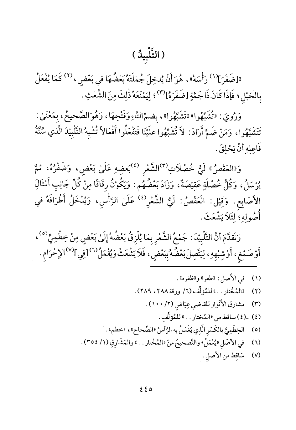 " [ضفر] رأسه"، هو أن يدخل جملته بعضها في بعض، كما يفعل بالحبل؛ فإذا كان ذا جمة [ضفره]؛ ليمنعه ذلك من الشعث.