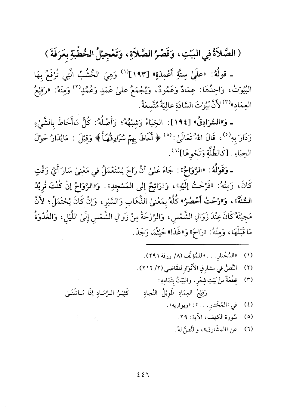 قوله: "على ستة أعمدة" [193] وهي الخشب التي ترفع بها البيوت، واحدها: عماد وعمود، ويجمع على عمد وعمد ومنه: "رفيع العماد" لأن بيوت السادة عالية متسعة.