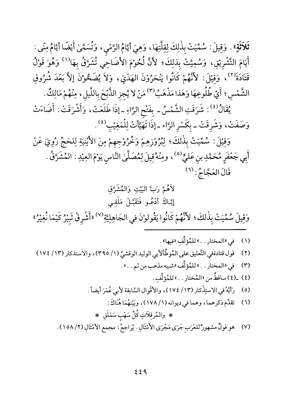 ثلاثة". وقيل: سميت بذلك لقلتها، وهي أيام الرمي، وتسمى أيضاً أيام منى: أيام التشريق، وسميت بذلك؛ لأن لحوم الأضاحي تشرق بها وهو قول قتادة، وقيل: لأنهم كانوا ينحرون الهدي، ولا يضحون إلا بعد شروق الشمس؛ أي طلوعها وهذا مذهب من لا يجز الذبح بالليل، منهم مالك.