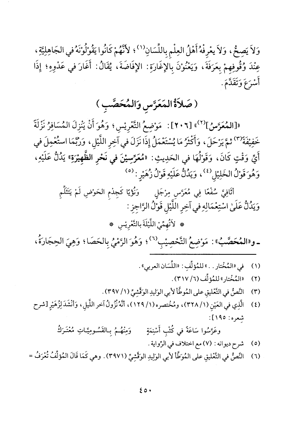 " [المعرس] " [206]: موضع التعريس؛ وهو أن ينزل المسافر نزله خفيفة ثم يرحل، وأكثر ما يستعمل إذا نزل في آخر الليل، وربما استعمل في أي وقت كان، وقولها في الحديث: "معرسين في نحر الظهيرة" يدل عليه، وهو قول الخليل، ويدل عليه قول زهير: