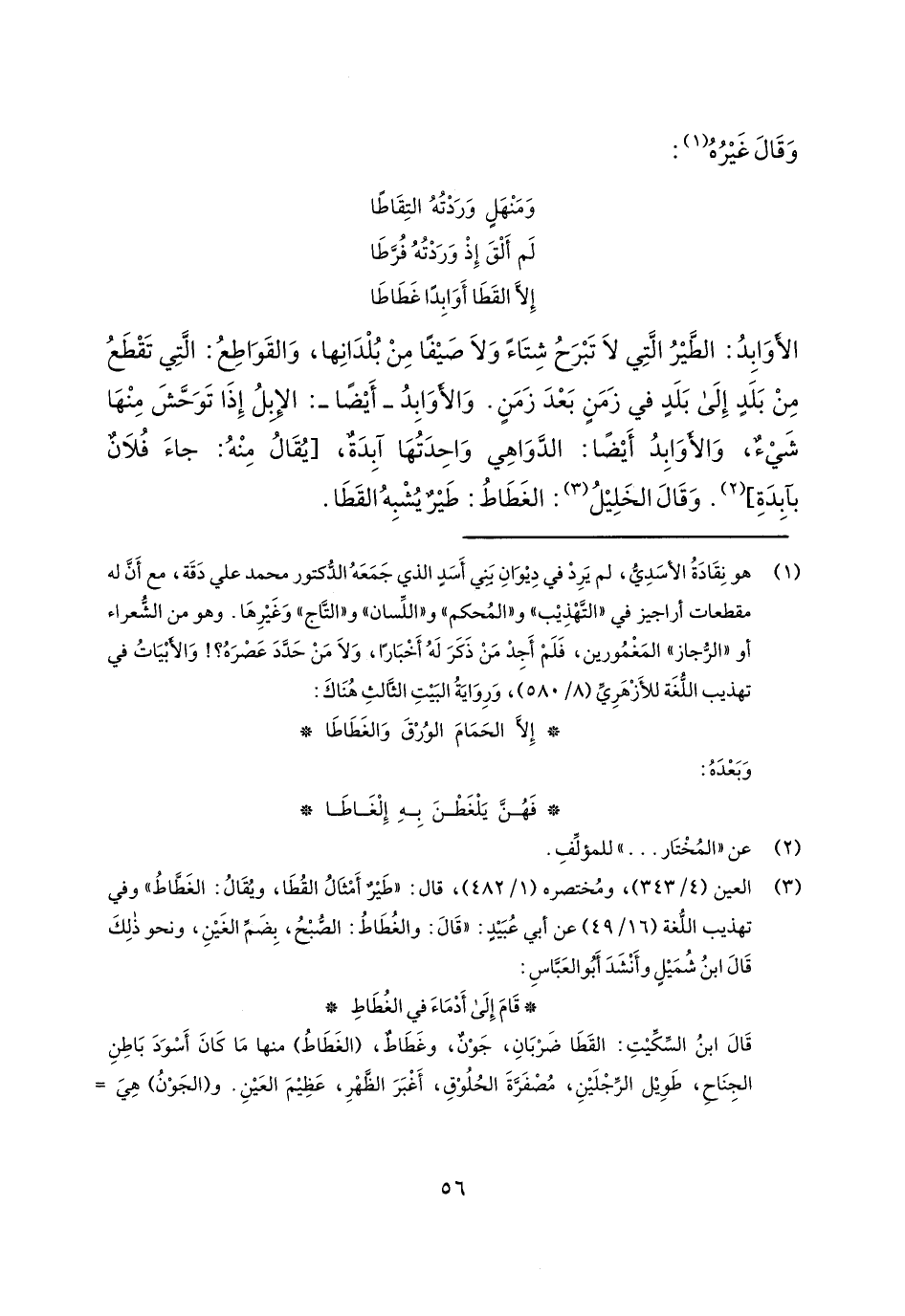 الأوابد: الطير التي لا تبرح شتاءً ولا صيفاً من بلدانها، والقواطع: التي تقطع من بلدٍ إلى بلد في زمنٍ بعد زمنٍ. والأوابد - أيضاً-: الإبل إذا توحش منها شيءٌ، والأوابد أيضاً: الدواهي واحدتها آبدة، [يقال منه: جاء فلانٌ بآبدة]. وقال الخليل: الغطاط: طيرٌ يشبه القطا.
