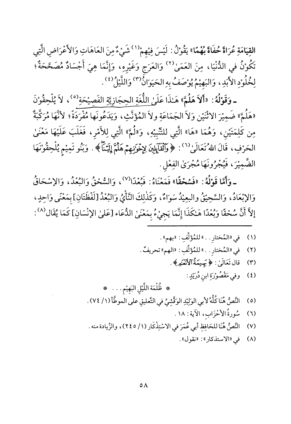 القيامة عراةً حفاةً بهماً" يقول: ليس فيهم شيءٌ من العاهات والأعراض التي تكون في الدنيا، من العمى والعرج وغيره، وإنما هي أجسادٌ مصححةٌ؛ لخلود الأبد، والبهيم يوصف به الحيوان والليل.