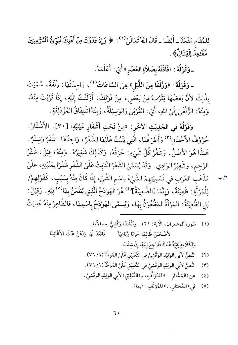 وقوله في الحديث الآخر: "من تحت أشفار عينيه" [30]. الأشفار: حروف الأجفان وأطرافها، التي ينبت عليها الشعر، واحدها: شفرٌ وشفرٌ. هذا هو الأصل. وشفر كل شيءٍ: حرفه، وكذلك شفيره. ومنه؛ قيل: شفر الرحم، وشفير الوادي. وقد يُسمى الشعر النابت على الشفر شفراً بمنبته، على مذهب العرب في تسميتهم الشيء باسم الشيء إذا كان منه بسببٍ، كقولهم 6/ب/ للمرأة: ظعينةٌ، وإنما [الظعينة] هو الهودج الذي يُظعن بها فيه. وقيل: بل الظعينة: المرأة المظعون بها، ويسمى الهودج باسمها، فالظاهر منه حديث
