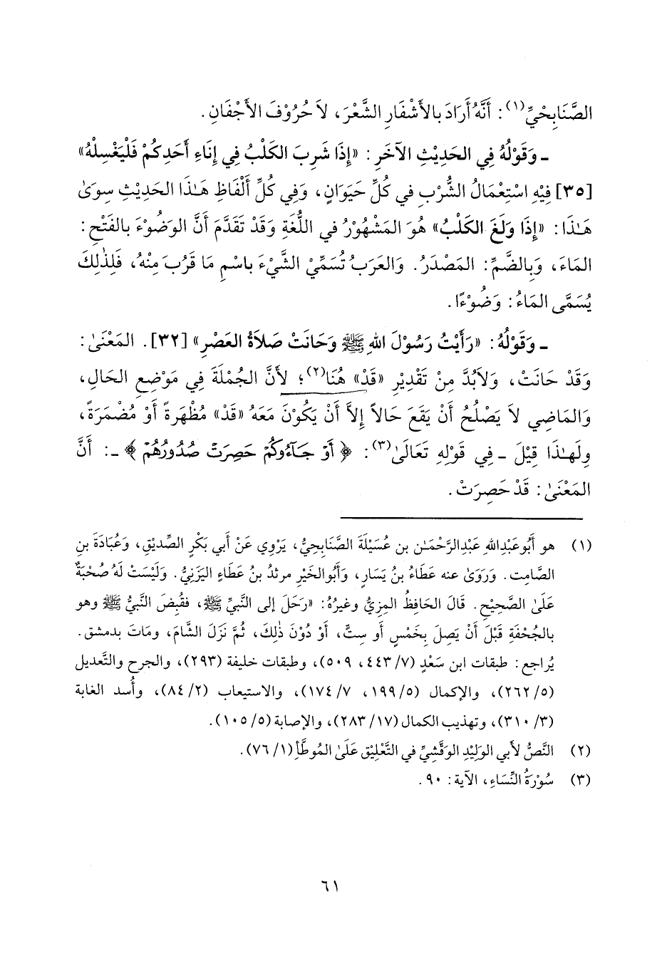 - وقوله: "رأيت رسول الله صلى الله عليه وسلم وحانت صلاة العصر" [32]. المعنى: وقد حانت، ولا بد من تقدير "قد" هنا؛ لأن الجملة في موضع الحال، والماضي لا يصلح أن يقع حالاً إلا أن يكون معه "قد" مظهرةً أو مضمرةً، ولهذا قيل- في قوله تعالى: {أَوْ جَاءُوكُمْ حَصِرَتْ صُدُورُهُمْ} -: أن المعنى: قد حصرت.
