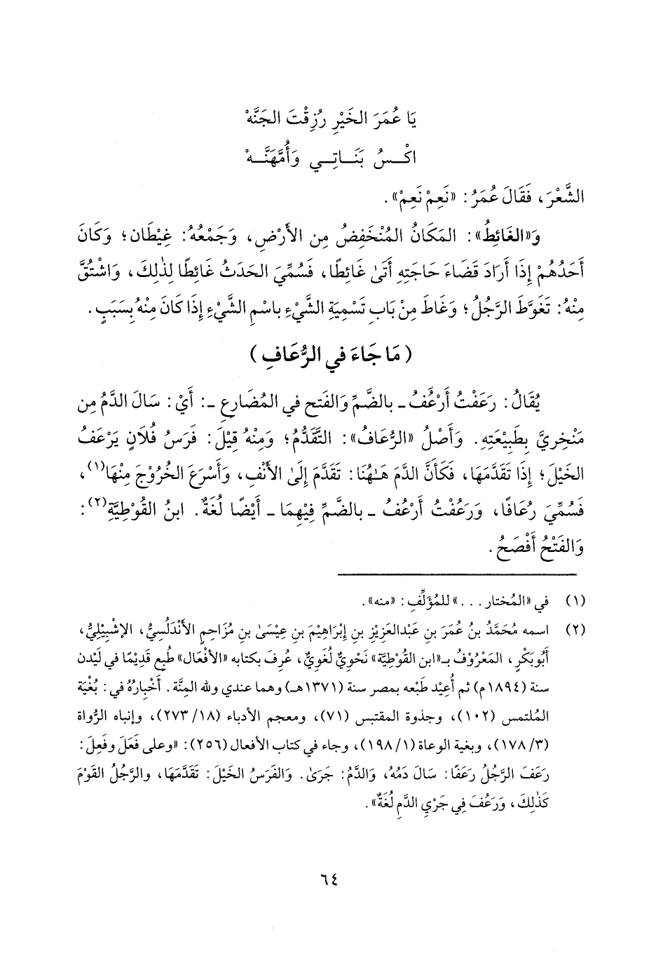 يقال: رعفت أرعف- بالضم والفتح في المضارع-: أي: سال الدم من منخرفي بطبيعته. وأصل "الرعاف": التقدم؛ ومنه قيل: فرس فلانٍ يرعف الخيل؛ إذا تقدمها، فكأن الدم هاهنا: تقدم إلى الأنف، وأسرع الخروج منها، فسمي رعافاً، ورعفت أرعف- بالضم فيهما- أيضاً لغةٌ. ابن القوطية: والفتح أفصح.