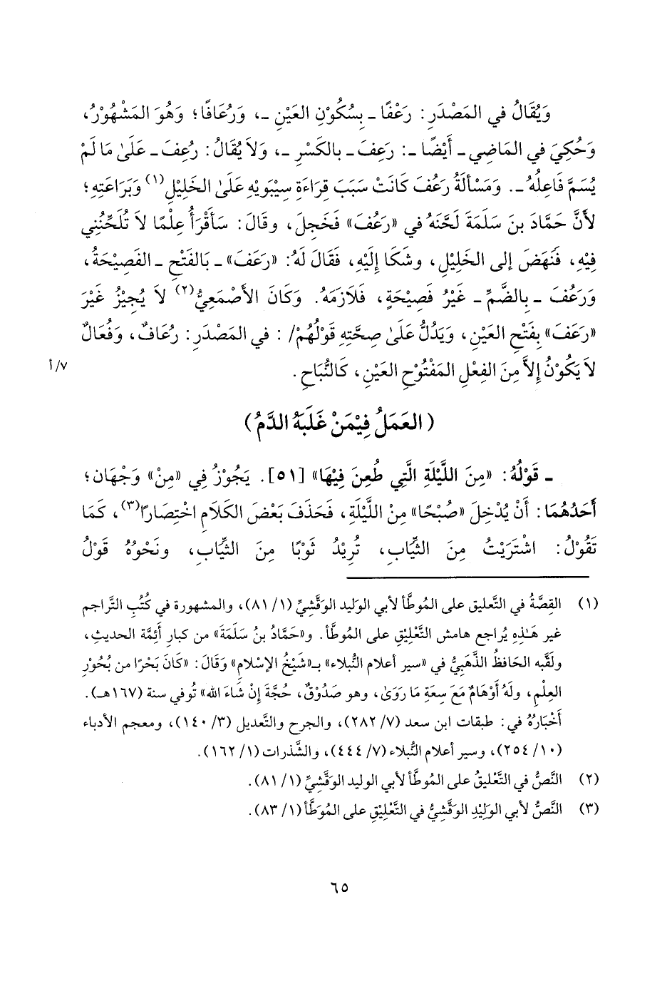 ويقال في المصدر: رعفا - بسكون العين-، ورعافاً؛ وهو المشهور، وحكي في الماضي - أيضاً-: رعف- بالكسر-، ولا يقال: رعف- على ما لم يسم فاعله-. ومسألة رعف كانت سبب قراءة سيبويه على الخليل وبراعته؛ لأن حماد بن سلمة لحنه في "رعف" فخجل، وقال: سأقرأ علماً لا تلحنني فيه، فنهض إلى الخليل، وشكا إليه، فقال له: "رعف"- بالفتح- الفصيحة، ورعف- بالضم- غير فصيحةٍ، فلازمه. وكان الأصمعي لا يجيز غير "رعف" بفتح العين، ويدل على صحته قولهم 7/أ/: في المصدر: رعافٌ، وفعالٌ لا يكون إلا من الفعل المفتوح العين، كالنباح.