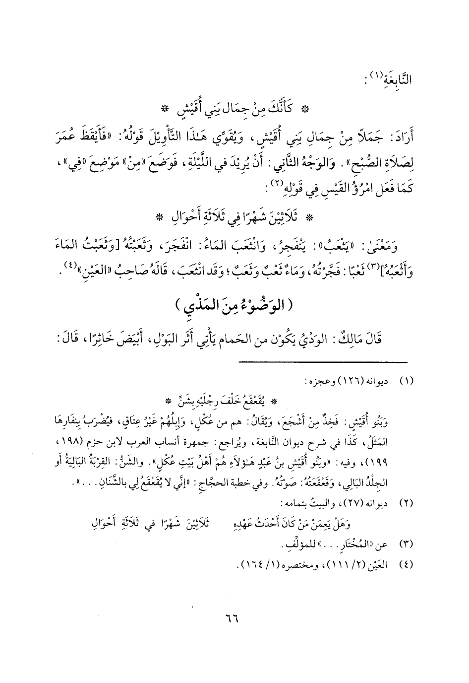قال مالكٌ: الودي يكون من الحمام يأتي أثر البول، أبيض خاثراً، قال: