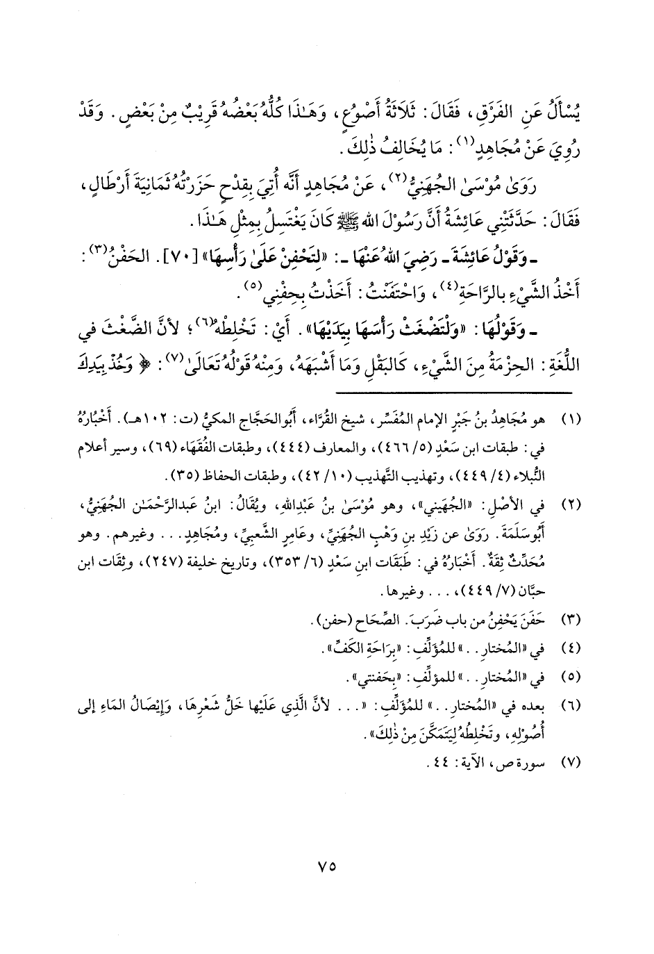 - وقول عائشة- رضي الله عنها-: "لتحفن على رأسها" [70]. الحفن: أخذ الشيء بالراحة، واحتفنت: أخذت بحفني.