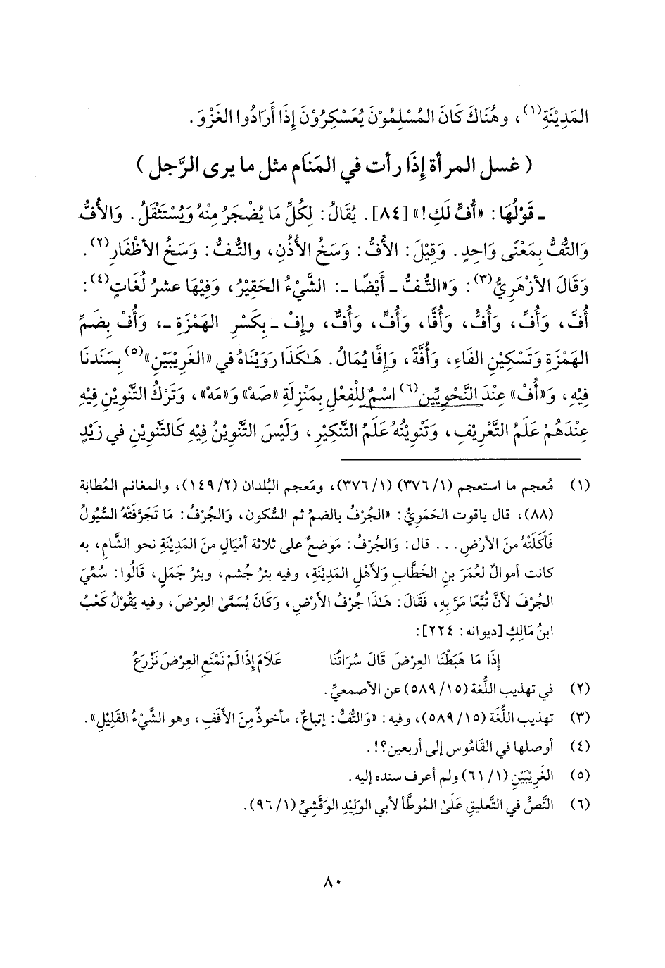 - قولها: "أفٍّ لك! " [84]. يقال: لكل ما يضجر منه ويستثقل. والأف والتف بمعنىً واحدٍ. وقيل: الأف: وسخ الأذن، والتف: وسخ الأظفار. وقال الأزهري: و"التف- أيضاً-: الشيء الحقير، وفيها عشرُ لغاتٍ: أُفٍّ، وأُفِّ، وأُفُّ، وأُفاً، وأفٍّ، وأُفٌّ، وإف- بكسر الهمزة-، وأف بضم الهمزة وتسكين الفاء، وأفةً، وإفا يمال. هكذا رويناه في "ألغريبين" بسندنا فيه، و"أُف" عند النحويين اسمٌ للفعل بمنزلة "صه" و"مه"، وترك التنوين فيه عندهم علم التعريف، وتنوينه علم التنكير، وليس التنوين فيه كالتنوين في زيدٍ