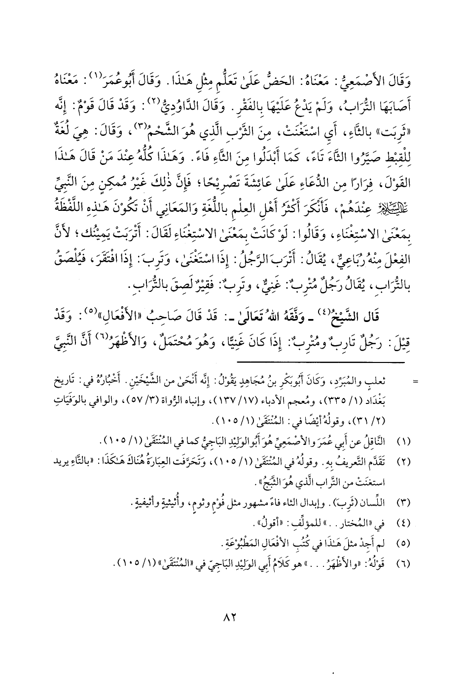 وقال الأصمعي: معناه: الحض على تعلم مثل هذا. وقال أبو عمر: معناه أصابها التراب، ولم يدع عليها بالفقر. وقال الداودي: وقد قال قومٌ: إنه "ثربت" بالثاء، أي استغنت، من الثرب الذي هو الشحم، وقال: هي لغةٌ للقبط صيروا الثاء تاءً، كما أبدلوا من الثاء فاءً. وهذا كله عند من قال هذا القول، فراراً من الدعاء على عائشة تصريحاً؛ فإن ذلك غير ممكنٍ من النبي عليه السلام عندهم، فأنكر أكثر أهل العلم باللغة والمعاني أن تكون هذه اللفظة بمعنى الاستغناء، وقالوا: لو كانت بمعنى الاستغناء لقال: أتربت يمينك؛ لأن الفعل منه رباعيٌ، يقال: أترب الرجل: إذا استغنى، وترب: إذا افتقر، فيلصق بالتراب، يقال رجلٌ متربٌ: غنيٌ، وتربٌ: فقير لصق بالتراب.