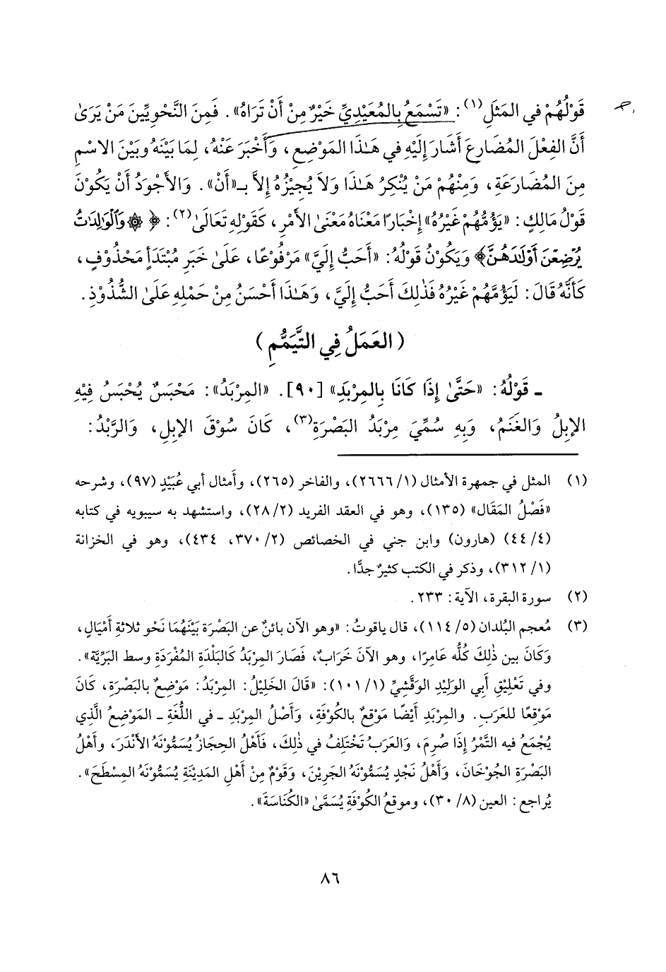 قولهم في المثل: "تسمع بالمعيدي خيرٌ من أن تراه". فمن النحويين من يرى أن الفعل المضارع أشار إليه في هذا الموضع، وأخبر عنه، لما بينه وبين الاسم من المضارعة، ومنهم من ينكر هذا ولا يجيزه إلا بـ"أن". والأجود أن يكون قول مالكٍ: "يؤمهم غيره" إخباراً معناه معنى الأمر، كقوله تعالى: {وَالْوَالِدَاتُ يُرْضِعْنَ أَوْلَادَهُنَّ} ويكون قوله: "أحب إلي" مرفوعاً، على خبر مبتدأٍ محذوفٍ، كأنه قال: ليؤمهم غيره فذلك أحب إلي، وهذا أحسن من حمله على الشذوذ.