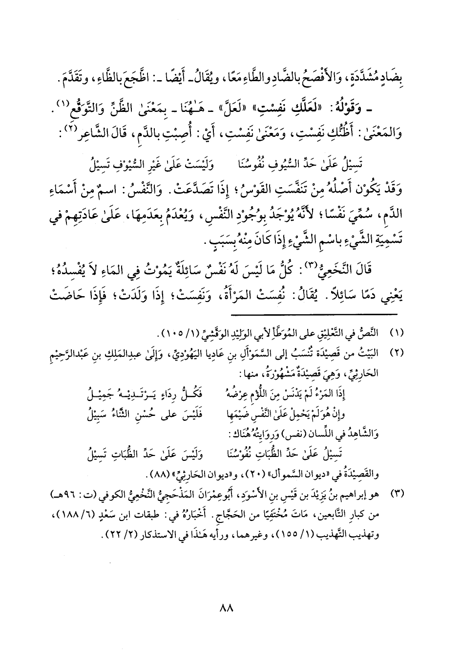 وقد يكون أصله من تنفست القوس؛ إذا تصدعت. والنفس: اسمٌ من أسماء الدم، سمي نفساً؛ لأنه يوجد بوجود النفس، ويعدم بعدمها، على عادتهم في تسمية الشيء باسم الشيء إذا كان منه بسببٍ.