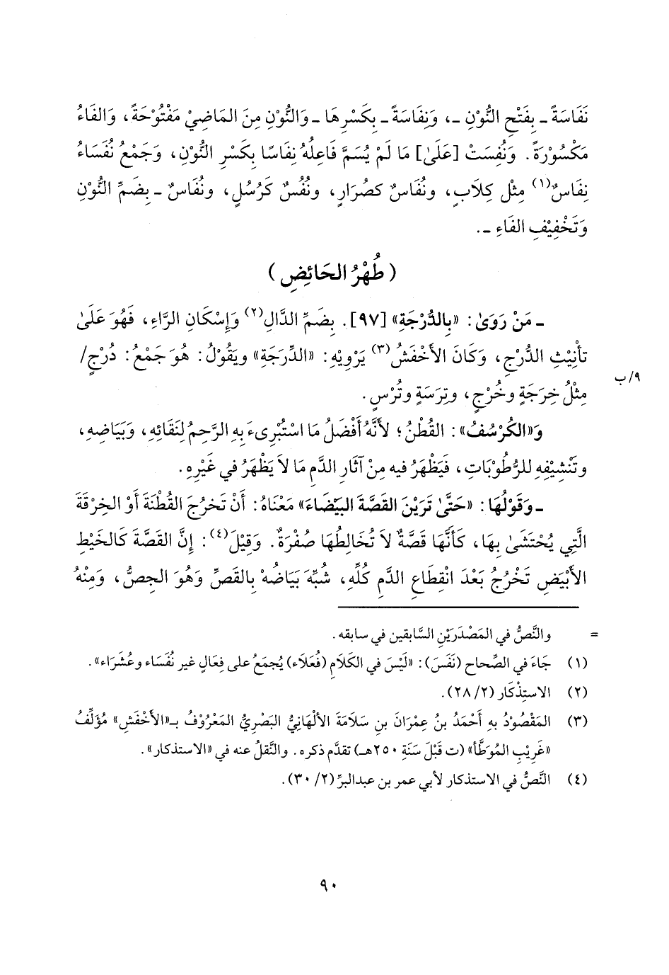 - وقولها: "حتى ترين القصة البيضاء" معناه: أن تخرج القطنة أو الخرقة التي يحتشى بها، كأنها قصةٌ لا تخالطها صفرةٌ. وقيل: إن القصة كالخيط الأبيض تخرج بعد انقطاع الدم كله، شبه بياضه بالقص وهو الجص، ومنه