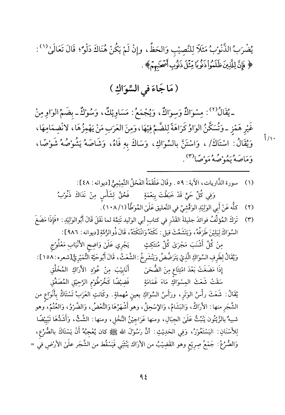 - يقال: مسواكٌ وسواكٌ، ويجمع: مساويكٌ، وسوكٌ - بضم الواو من غير همزٍ- وتسكن الواو كراهةً للضم فيها، ومن العرب من يهمزها، لانضمامها، ويقال: استاك 10/أ/، واستن بالسواك، وساك به فاه، وشاصه يشوصه شوصاً، وماصه يموصه موصاً.