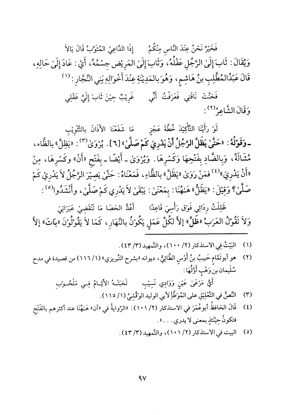 - وقوله: "حتى يظل الرجل أن يدري كم صلى" [6]. يروى: "يظل" بالظاء، مشالةً، وبالضاد بفتحها وكسرها. ويروى - أيضاً- بفتح "أن" وكسرها، من "أن يدري" فمن روى "يظل" بالظاء، فمعناه: حتى يصير الرجل لا يدري كم صلى؟ وقيل: "يظل هاهنا: بمعنى: يبقى لا يدري كم صلى، وأنشدوا: