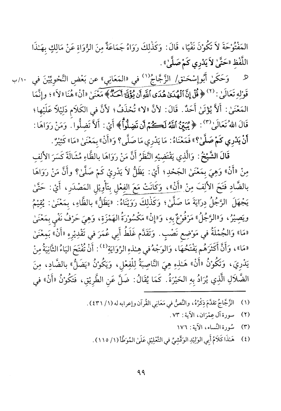 قال الشيخ: والذي يقتضيه النظر أن من رواها بالظاء مشالةً كسر الألف من "أن" وهي بمعنى الجحد؛ أي: يظل لا يدري كم صلى؟ وأن من رواها بالضاد فتح الألف من "أن"، وكانت مع الفعل بتأويل المصدر، أي: حتى يجهل الرجل دراية ما صلى؛ وكذلك رويناه: "يظل" بالظاء، بمعنى: يقيم ويصير، و"الرجل" مرفوعٌ به، و"إن" مكسورة الهمزة، وهي حرف نفي بمعنى "ما" والجملة في موضع نصبٍ. وتقدم غلط أبي عمر في تقديره "أن" بمعنى "ما"، وأن أكثرهم يفتحها، والوجه في هذه الرواية: أن تفتح الياء الثانية من الضلال الذي يراد به الحيرة. كما يقال: ضل عن الطريق، فتكون "أن" في