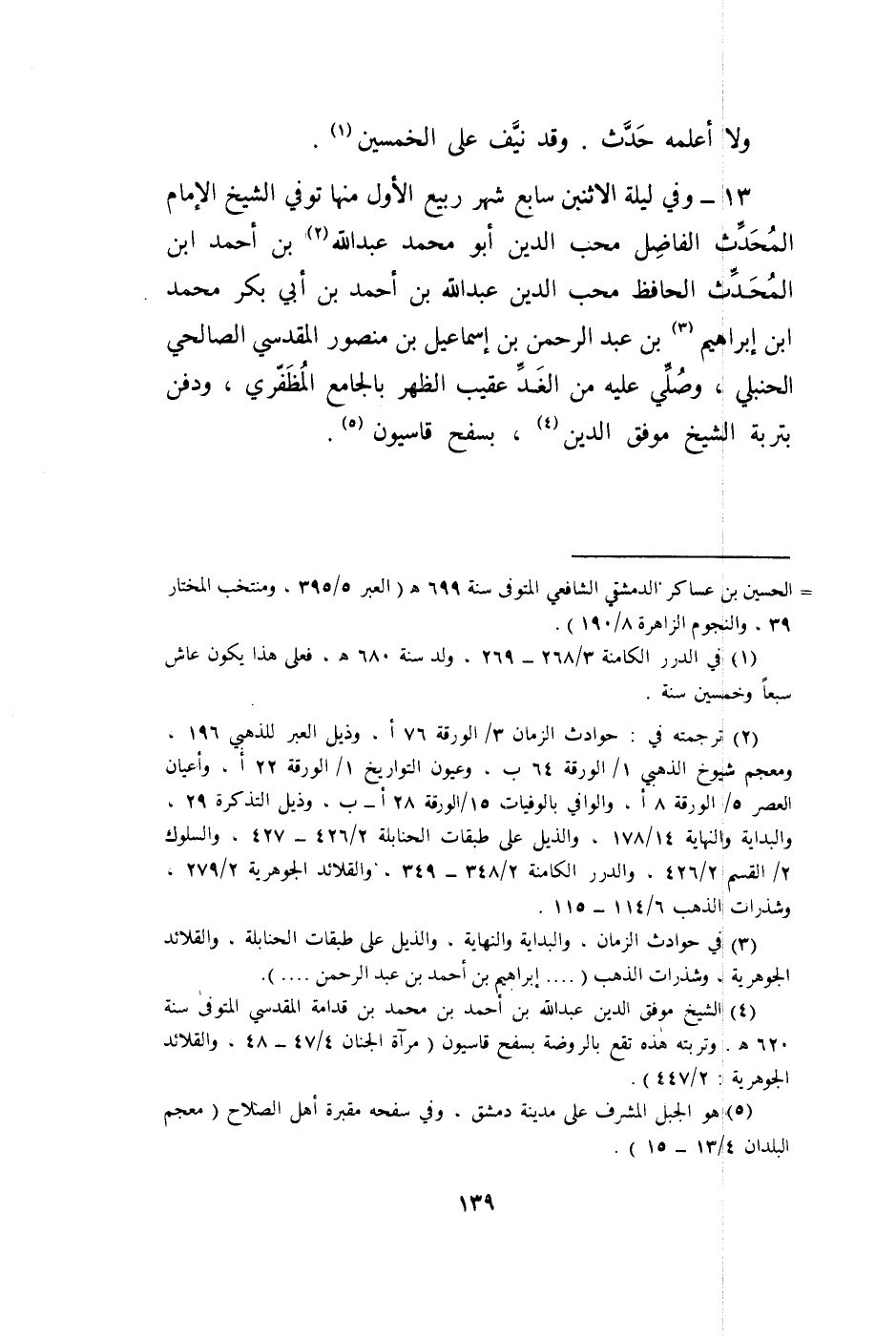 وَلَا أعلمهُ حدث وَقد نَيف على الْخمسين 13 وَفِي لَيْلَة الْإِثْنَيْنِ سَابِع شهر ربيع الأول مِنْهَا توفّي الشَّيْخ الإِمَام الْمُحدث الْفَاضِل محب الدّين أَبُو مُحَمَّد عبد الله بن أَحْمد ابْن الْمُحدث الْحَافِظ محب الدّين عبد الله بن أَحْمد بن ابي بكر مُحَمَّد ابْن إِبْرَاهِيم بن عبد الرَّحْمَن بن اسماعيل بن مَنْصُور الْمَقْدِسِي الصَّالِحِي الْحَنْبَلِيّ وَصلي عَلَيْهِ من الْغَد عقيب الظّهْر بالجامع المظفري وَدفن بتربة الشَّيْخ موفق الدّين بسفح قاسيون