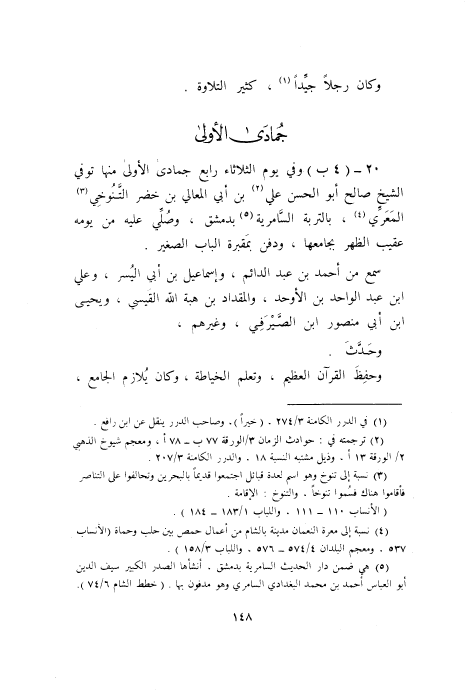 20 - (4 ب) وَفِي يَوْم الثُّلَاثَاء رَابِع جُمَادَى الأولى مِنْهَا توفّي الشَّيْخ صَالح أَبُو الْحسن عَليّ بن أبي الْمَعَالِي بن خضر التنوخي المعري بالتربة السامرية بِدِمَشْق وَصلي عَلَيْهِ من يَوْمه عقيب الظّهْر بجامعها وَدفن بمقبرة الْبَاب الصَّغِير