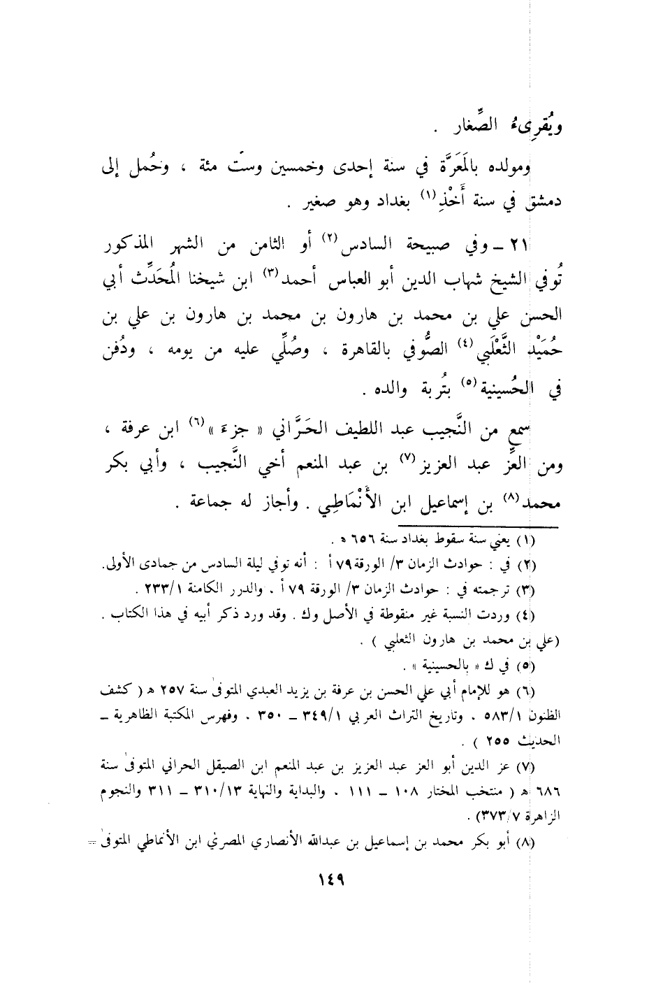 21 - وَفِي صَبِيحَة السَّادِس أَو الثَّامِن من الشَّهْر الْمَذْكُور توفّي الشَّيْخ شهَاب الدّين أَبُو الْعَبَّاس أَحْمد ابْن شَيخنَا الْمُحدث أبي الْحسن عَليّ بن مُحَمَّد بن هَارُون ابْن مُحَمَّد بن هَارُون بن عَليّ بن حميد الثَّعْلَبِيّ الصُّوفِي بِالْقَاهِرَةِ وَصلي عَلَيْهِ من يَوْمه وَدفن فِي الحسينية بتربة وَالِده