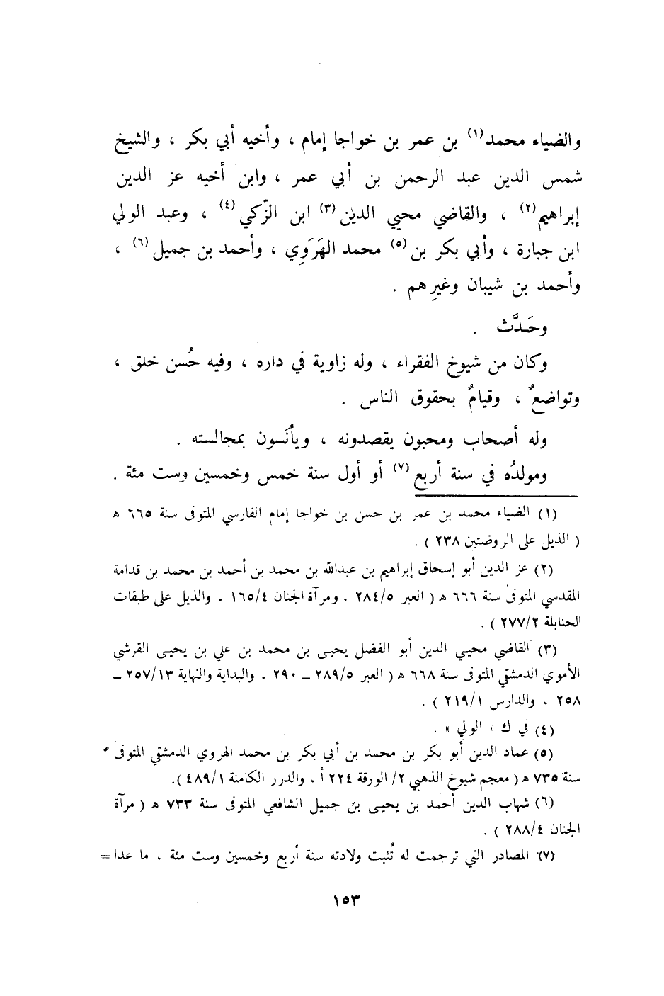 والضياء مُحَمَّد بن عمر بن خواجا إِمَام وأخيه أبي بكر وَالشَّيْخ شمس الدّين عبد الرَّحْمَن بن أبي عمر وَابْن أَخِيه عز الدّين إِبْرَاهِيم وَالْقَاضِي محيي الدّين ابْن الزكي وَعبد الْوَلِيّ ابْن جبارَة وَأبي بكر بن مُحَمَّد الْهَرَوِيّ وَأحمد بن جميل وَأحمد بن شَيبَان وَغَيرهم