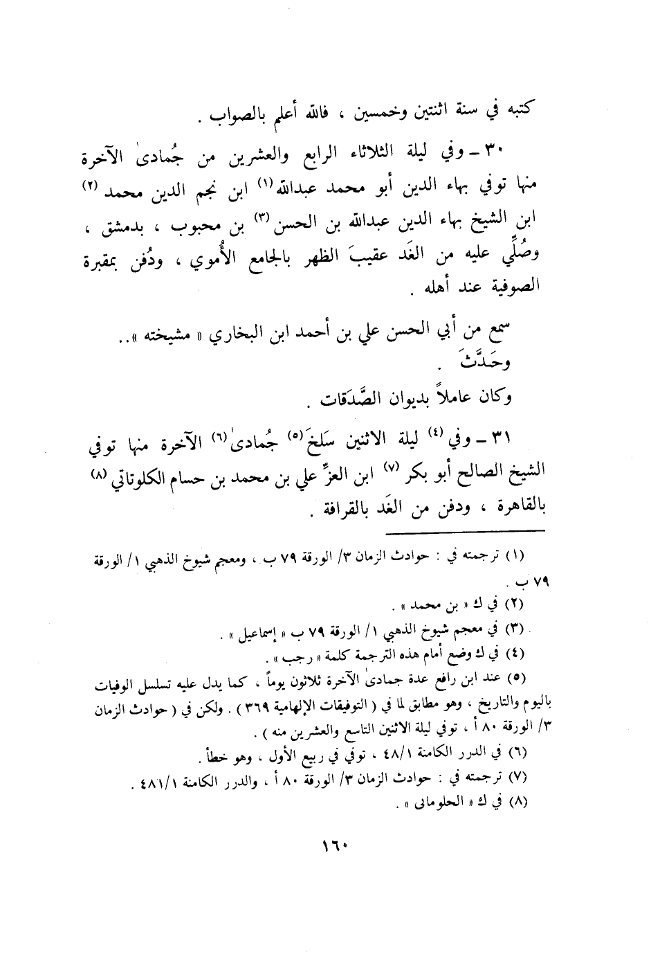 30 - وَفِي لَيْلَة الثُّلَاثَاء الرَّابِع وَالْعِشْرين من جُمَادَى الْآخِرَة مِنْهَا توفّي بهاء الدّين أَبُو مُحَمَّد عبد الله ابْن نجم الدّين مُحَمَّد ابْن الشَّيْخ بهاء الدّين عبد الله بن الْحسن بن مَحْبُوب بِدِمَشْق وَصلي عَلَيْهِ من الْغَد عقيب الظّهْر بالجامع الْأمَوِي وَدفن بمقبرة الصُّوفِيَّة عِنْد أَهله