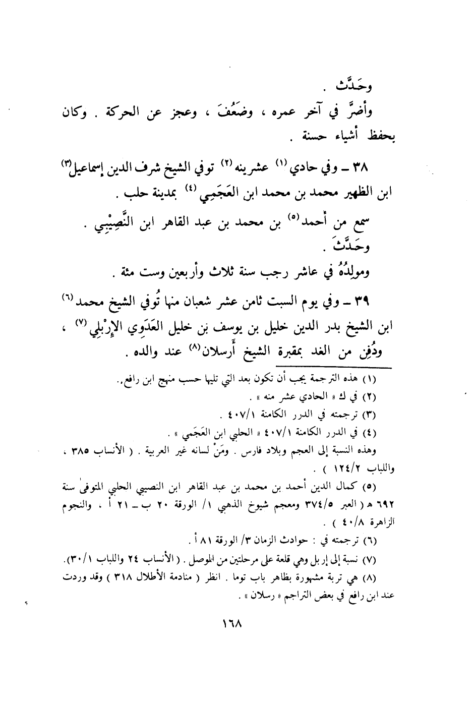 38 - وَفِي حادي عشرينه توفّي الشَّيْخ شرف الدّين إِسْمَاعِيل ابْن الظهير مُحَمَّد ابْن مُحَمَّد ابْن العجمي بِمَدِينَة حلب سمع من أَحْمد بن مُحَمَّد بن عبد القاهر ابْن النصيي
