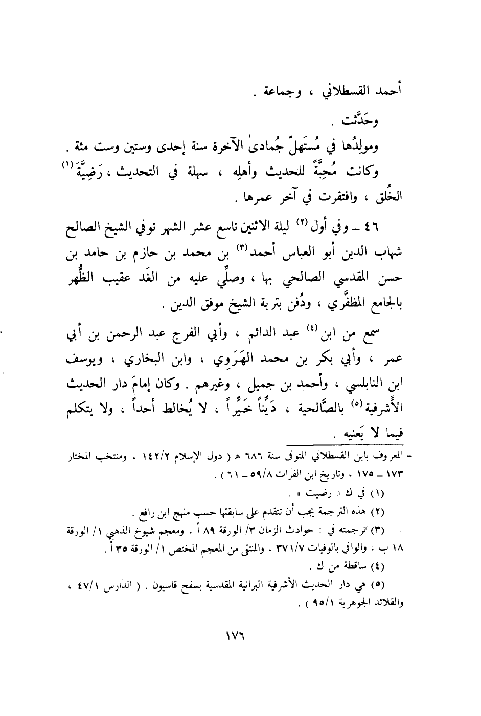 46 - وَفِي أول لَيْلَة الْإِثْنَيْنِ تَاسِع عشر الشَّهْر توفّي الشَّيْخ الصَّالح شهَاب الدّين أَبُو الْعَبَّاس أَحْمد بن مُحَمَّد حَازِم بن حَامِد بن حسن الْمَقْدِسِي الصَّالِحِي بهَا وَصلي عَلَيْهِ من الْغَد عقيب الظّهْر بالجامع المظفري وَدفن بتربة الشَّيْخ موفق الدّين