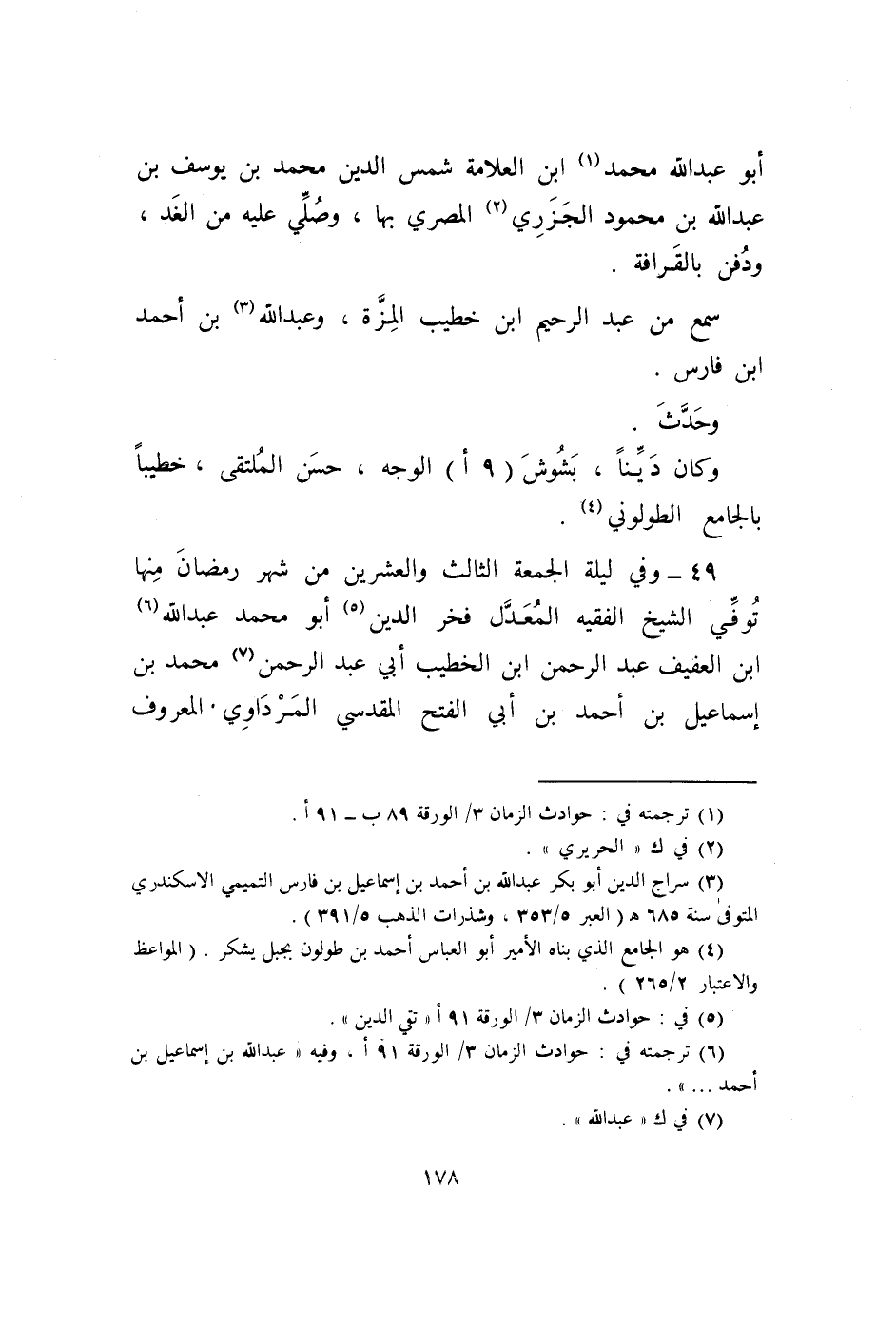 49 - وَفِي لَيْلَة الْجُمُعَة الثَّالِث وَالْعِشْرين من شهر رَمَضَان مِنْهَا توفّي الشَّيْخ الْفَقِيه الْمعدل فَخر الدّين أَبُو مُحَمَّد عبد الله ابْن الْعَفِيف عبد الرَّحْمَن ابْن الْخَطِيب أبي عبد الرَّحْمَن مُحَمَّد بن إِسْمَاعِيل بن أَحْمد بن أبي الْفَتْح الْمَقْدِسِي المرداوي الْمَعْرُوف