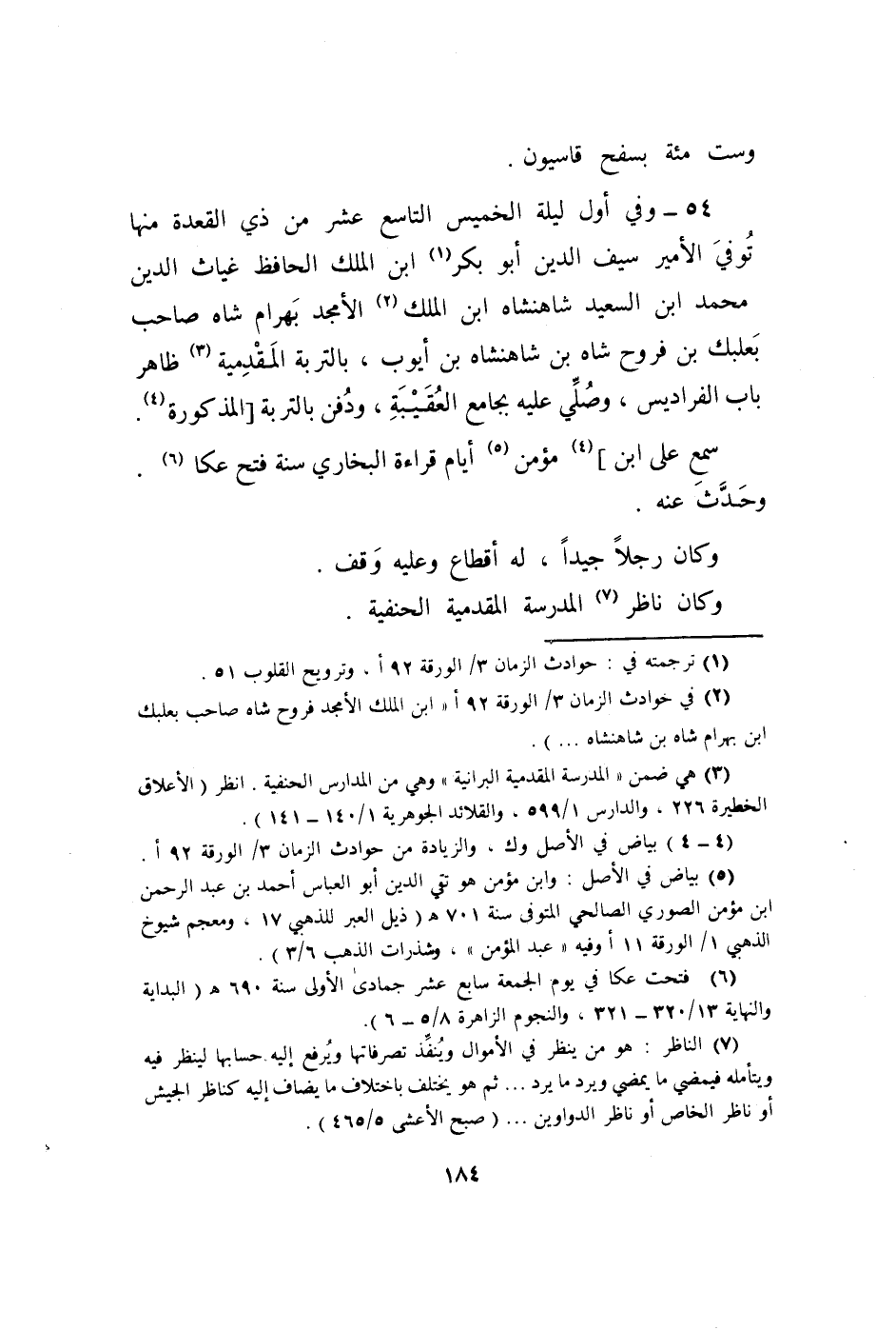 54 - وَفِي أول لَيْلَة الْخَمِيس التَّاسِع عشر من ذِي الْقعدَة مِنْهَا توفّي الْأَمِير سيف الدّين أَبُو بكر ابْن الْملك الْحَافِظ غياث الدّين مُحَمَّد ابْن السعيد شاهنشاه ابْن الْملك الأمجد بهْرَام شاه صَاحب بعلبك بن فَروح شاه بن شاهنشاه بن أَيُّوب بالتربة المقدمية ظَاهر بَاب الفراديس وَصلي عَلَيْهِ بِجَامِع العقيبة وَدفن بالتربة الْمَذْكُورَة
