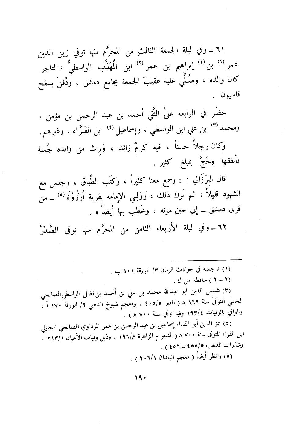 61 - وَفِي لَيْلَة الْجُمُعَة الثَّالِث من الْمحرم مِنْهَا توفّي زين الدّين عمر بن إِبْرَاهِيم ابْن عمر ابْن الْمُهَذّب الوَاسِطِيّ التَّاجِر كَانَ وَالِده وَصلي عَلَيْهِ عقيب الْجُمُعَة بِجَامِع دمشق وَدفن بسفح قاسيون