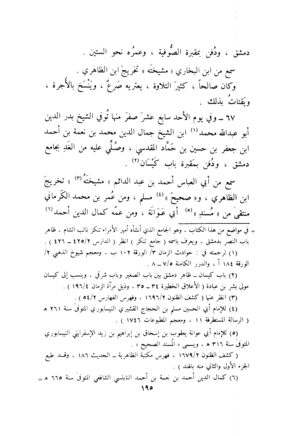 67 - وَفِي يَوْم الْأَحَد سَابِع عشر صفر مِنْهَا توفّي الشَّيْخ بدر الدّين أَبُو عبد الله مُحَمَّد ابْن الشَّيْخ جمال الدّين مُحَمَّد بن نعْمَة بن أَحْمد ابْن جَعْفَر ابْن حُسَيْن بن حَمَّاد الْمَقْدِسِي وَصلي عَلَيْهِ من الْغَد بِجَامِع دمشق وَدفن بمقبرة بَاب كيسَان 3 سمع من أبي الْعَبَّاس أَحْمد بن عبد الدَّائِم