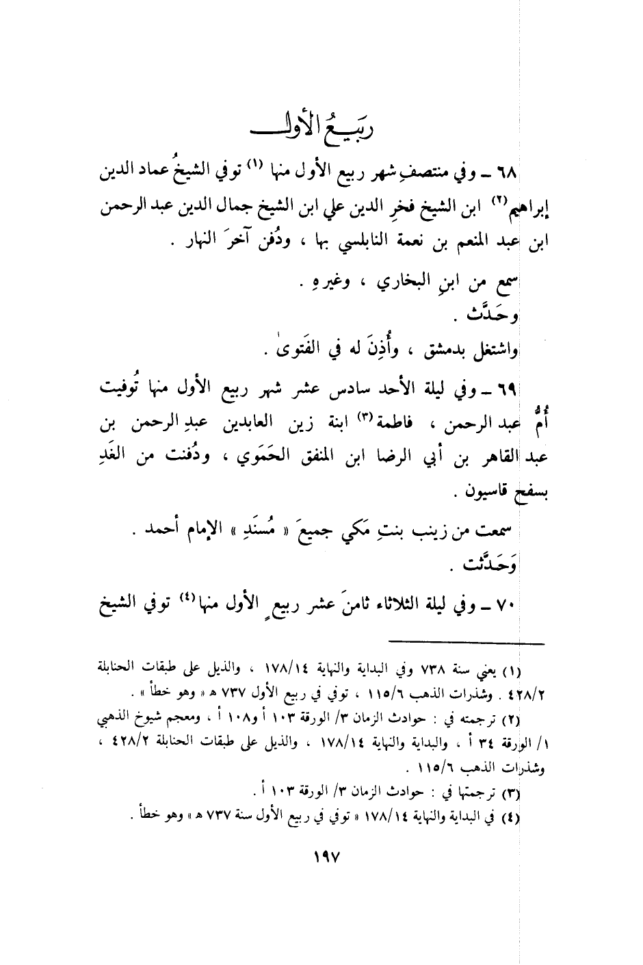 68 - وَفِي منتصف شهر ربيع الأول مِنْهَا توفّي الشَّيْخ عماد الدّين إِبْرَاهِيم ابْن الشَّيْخ فَخر الدّين عَليّ ابْن الشَّيْخ جمال الدّين عبد الرَّحْمَن ابْن عبد الْمُنعم ابْن نعْمَة النابلسي بهَا وَدفن آخر النَّهَار