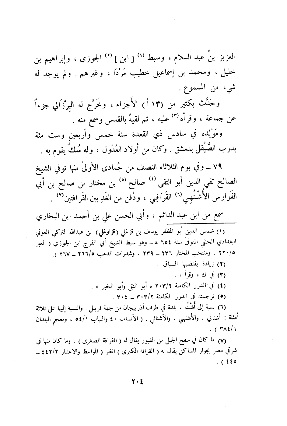 79 - وَفِي يَوْم الثُّلَاثَاء النّصْف من جُمَادَى الأولى مِنْهَا توفّي الشَّيْخ الصَّالح تَقِيّ الدّين أَبُو التقي صَالح بن مُخْتَار بن صَالح بن أبي الفوارس الأشنهي الْقَرَافِيّ وَدفن من الْغَد بَين القرافتين