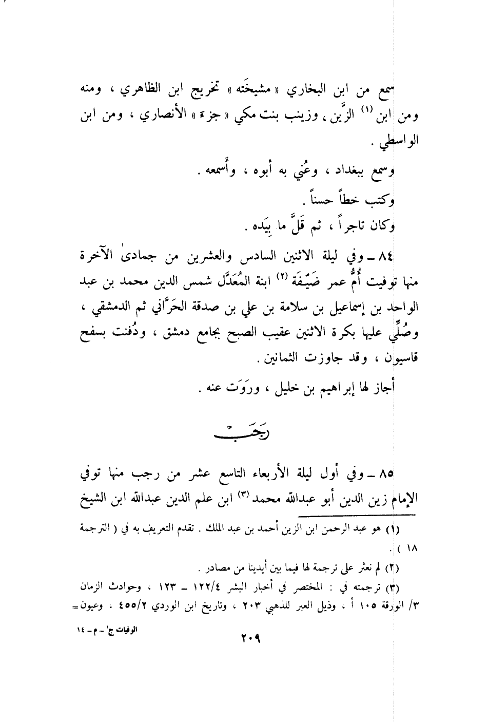 رَجَب وَفِي لَيْلَة الْأَرْبَعَاء التَّاسِع عشر من رَجَب مِنْهَا توفّي الإِمَام زين الدّين أَبُو عبد الله مُحَمَّد ابْن علم الدّين