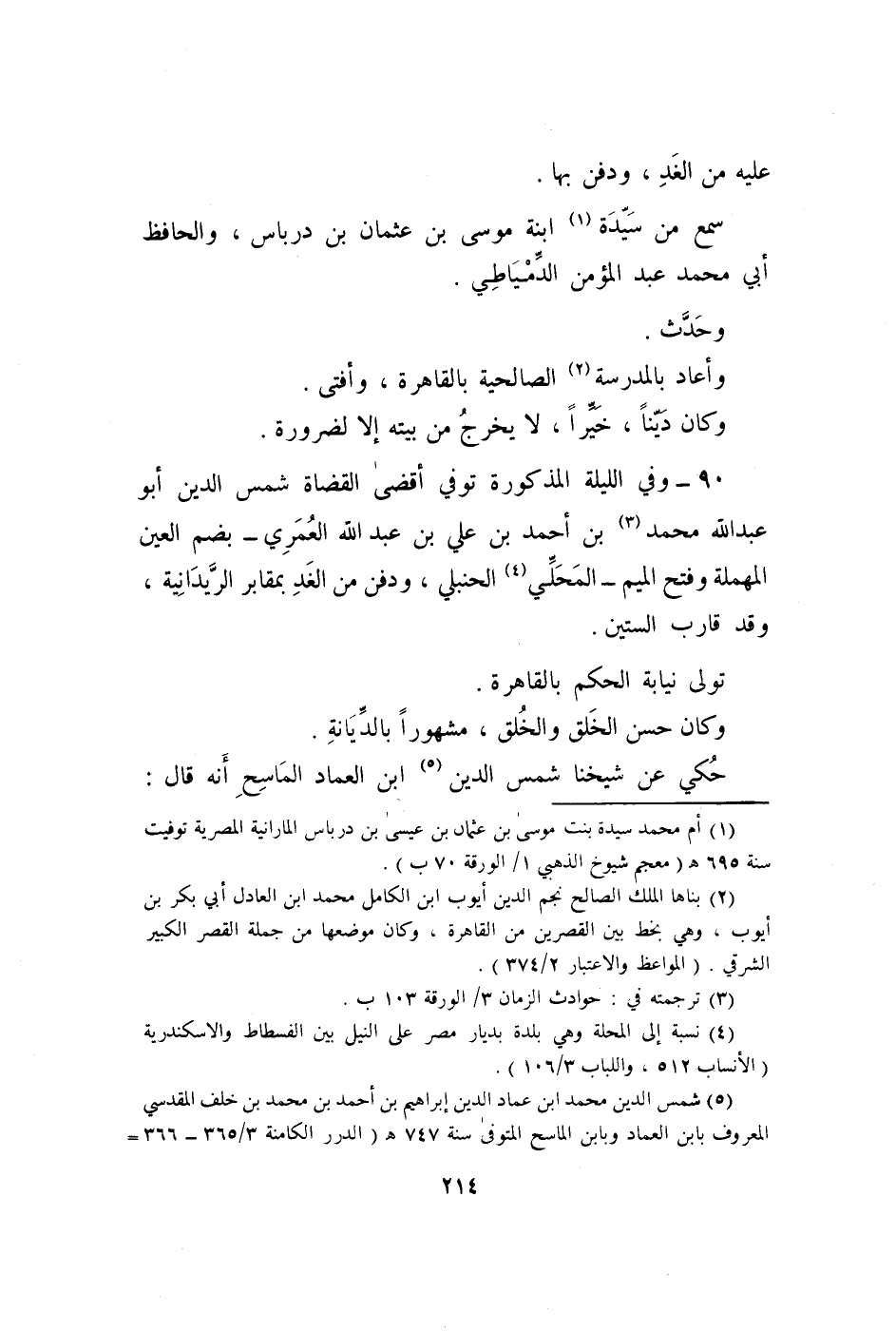 90 - وَفِي اللَّيْلَة الْمَذْكُورَة توفّي أقضى الْقُضَاة شمس الدّين أَبُو عبد الله مُحَمَّد ابْن أَحْمد بن عَليّ بن عبد الله الْعمريّ بِضَم الْعين الْمُهْملَة وَفتح الْمِيم الْمحلي الْحَنْبَلِيّ وَدفن من الْغَد بمقابر الريدانية وَقد قَارب السِّتين