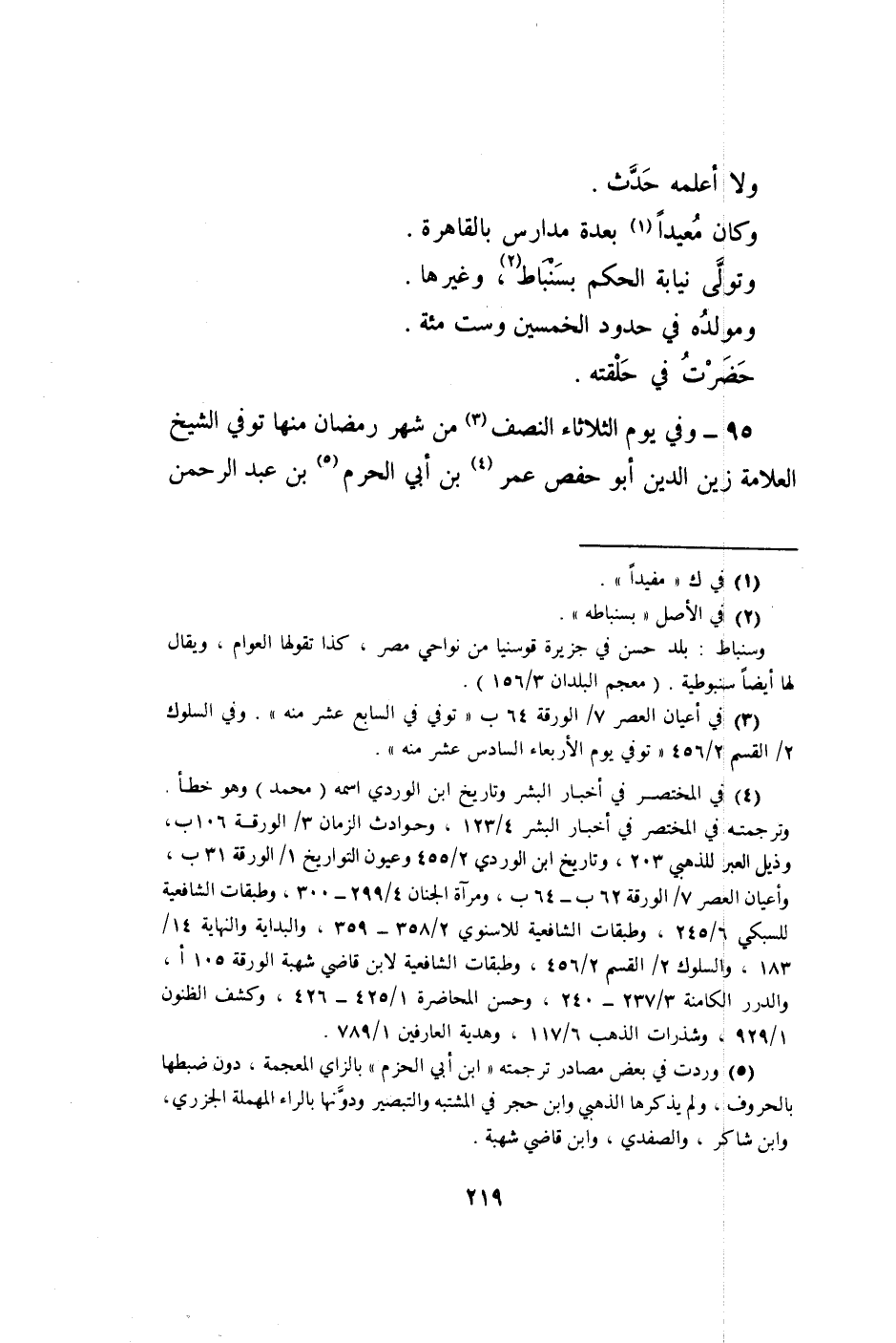 95 - وَفِي يَوْم الثُّلَاثَاء النّصْف من شهر رَمَضَان مِنْهَا توفّي الشَّيْخ الْعَلامَة زين الدّين أَبُو حَفْص عمر بن أبي الْحرم بن عبد الرَّحْمَن