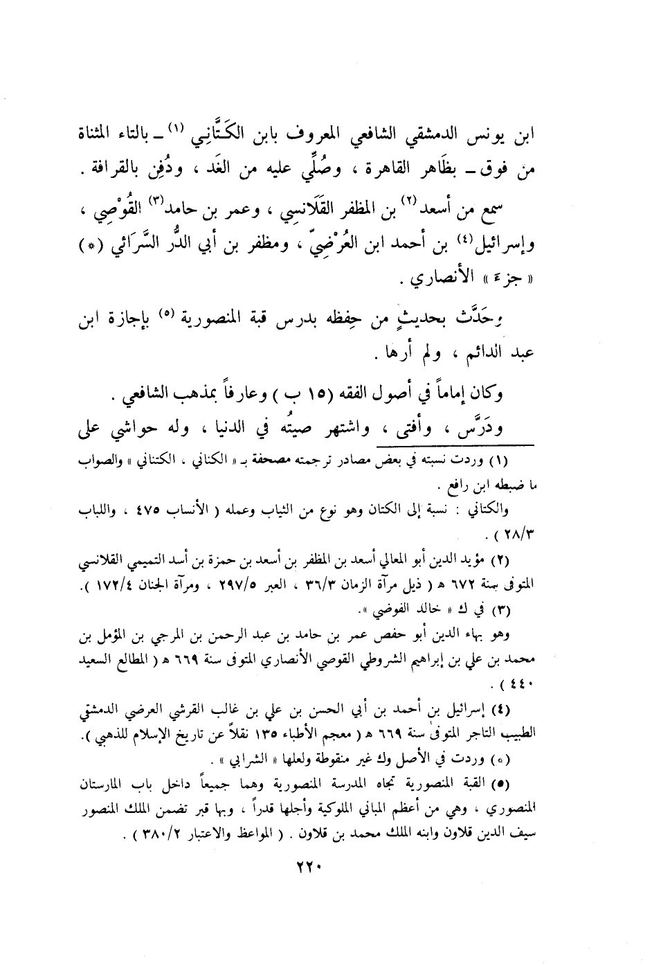 ابْن يُونُس الدِّمَشْقِي الشَّافِعِي الْمَعْرُوف بِابْن الكتاني بِالتَّاءِ الْمُثَنَّاة من فَوق بِظَاهِر الْقَاهِرَة وَصلي عَلَيْهِ من الْغَد وَدفن بالقرافة