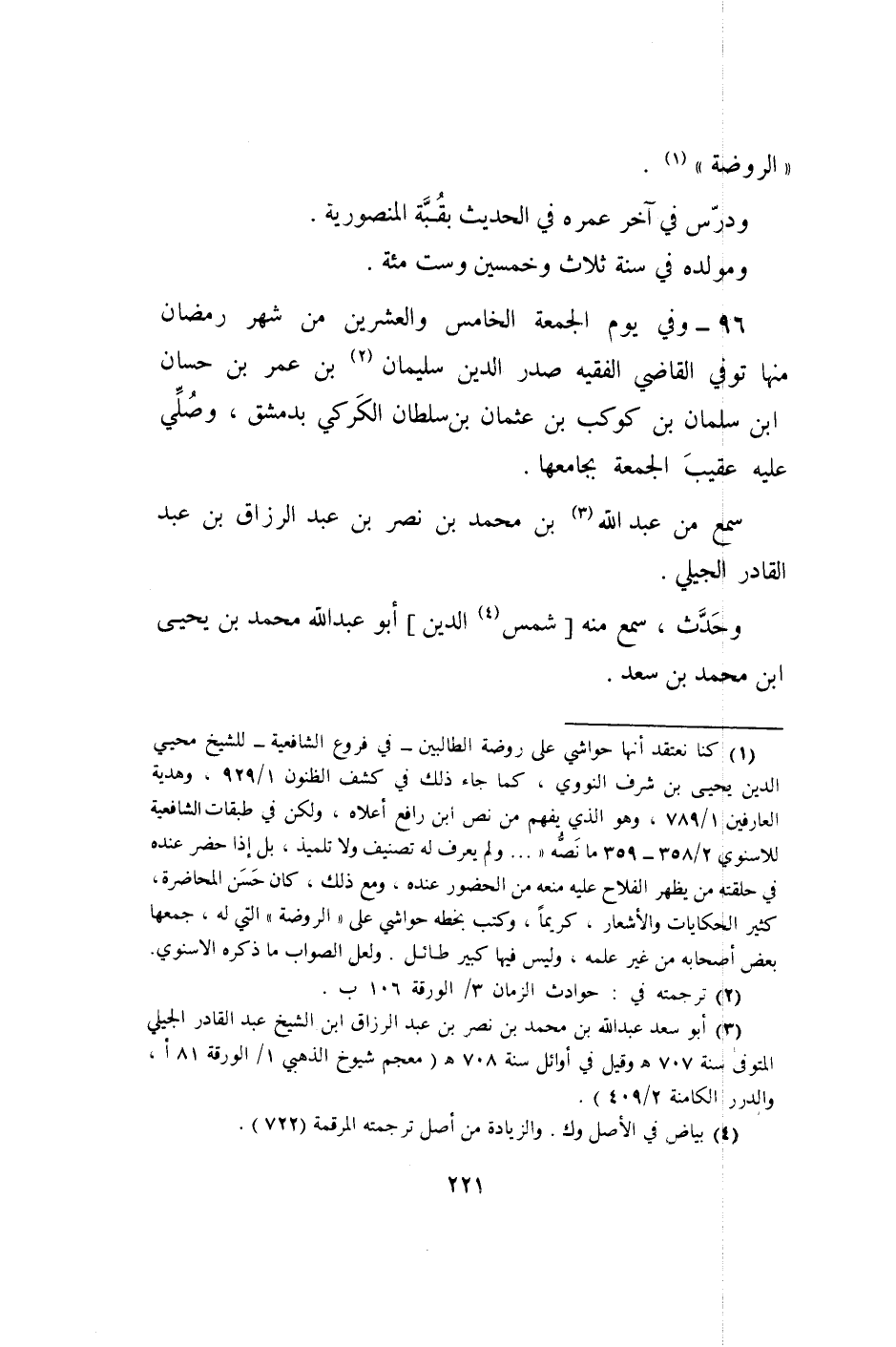 96 - وَفِي يَوْم الْجُمُعَة الْخَامِس وَالْعِشْرين من شهر رَمَضَان مِنْهَا توفّي القَاضِي الْفَقِيه صدر الدّين سُلَيْمَان بن عمر بن حسان بن سلمَان بن كَوْكَب بن عُثْمَان بن سُلْطَان الكركي بِدِمَشْق وَصلي عَلَيْهِ عقيب الْجُمُعَة بجامعها