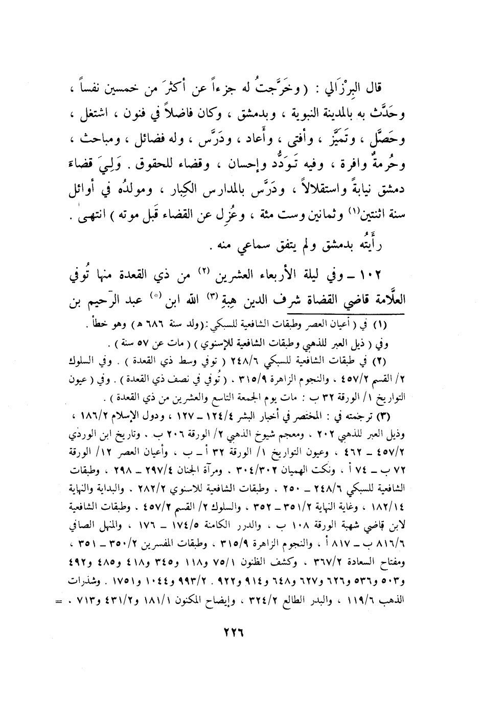 102 - وَفِي لَيْلَة الْأَرْبَعَاء الْعشْرين من ذِي الْقعدَة مِنْهَا توفّي الْعَلامَة قَاضِي الْقُضَاة الْقُضَاة شرف الدّين هبة الله ابْن عبد الرَّحِيم بن
