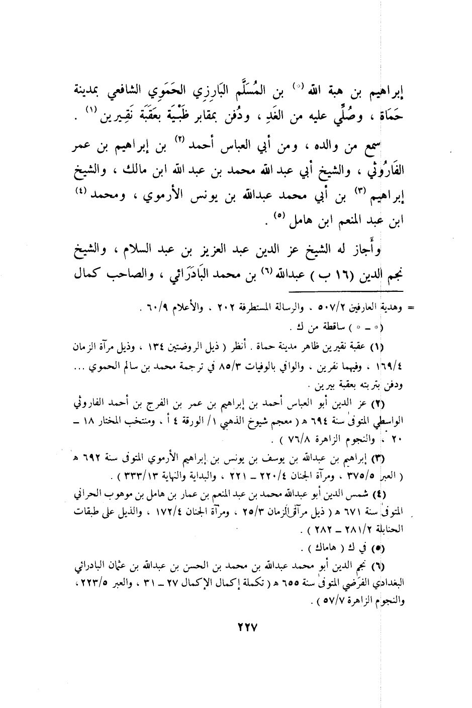 إِبْرَاهِيم بن هبة الله بن الْمُسلم الْبَارِزِيّ الْحَمَوِيّ الشَّافِعِي بِمَدِينَة حماة وَصلي عَلَيْهِ من الْغَد وَدفن بمقابر ظَبْيَة بعقبة نقيرين