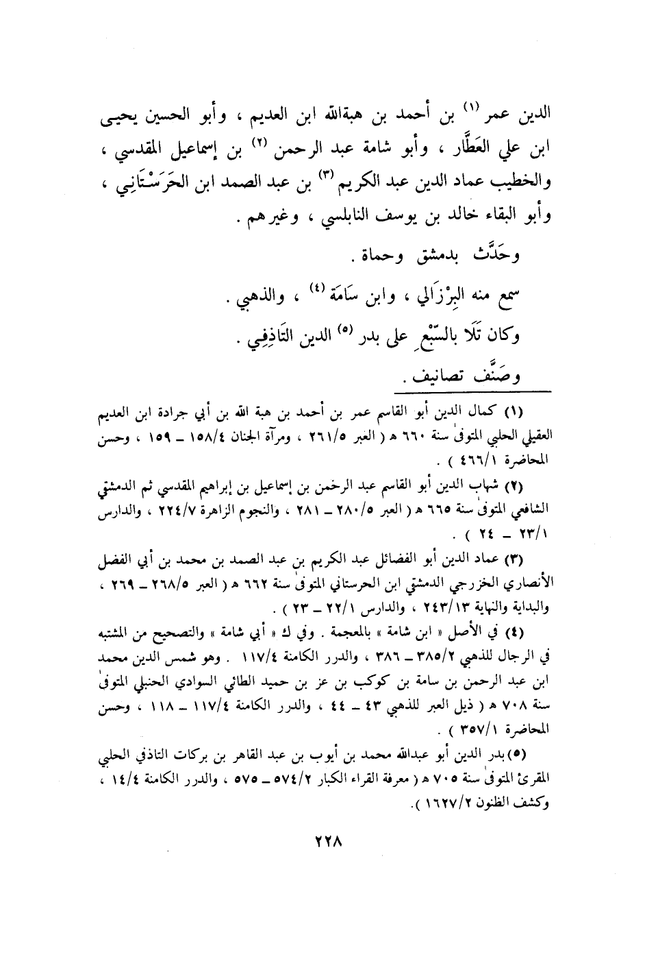 الدّين عمر بن أَحْمد بن هبة الله ابْن العديم وَأَبُو الْحُسَيْن يحيى ابْن عَليّ الْعَطَّار وَأَبُو شامة عبد الرَّحْمَن بن إِسْمَاعِيل الْمَقْدِسِي والخطيب عماد الدّين عبد الْكَرِيم بن عبد الصَّمد ابْن الحرستاني وَأَبُو الْبَقَاء خَالِد ابْن يُوسُف النابلسي وَغَيرهم