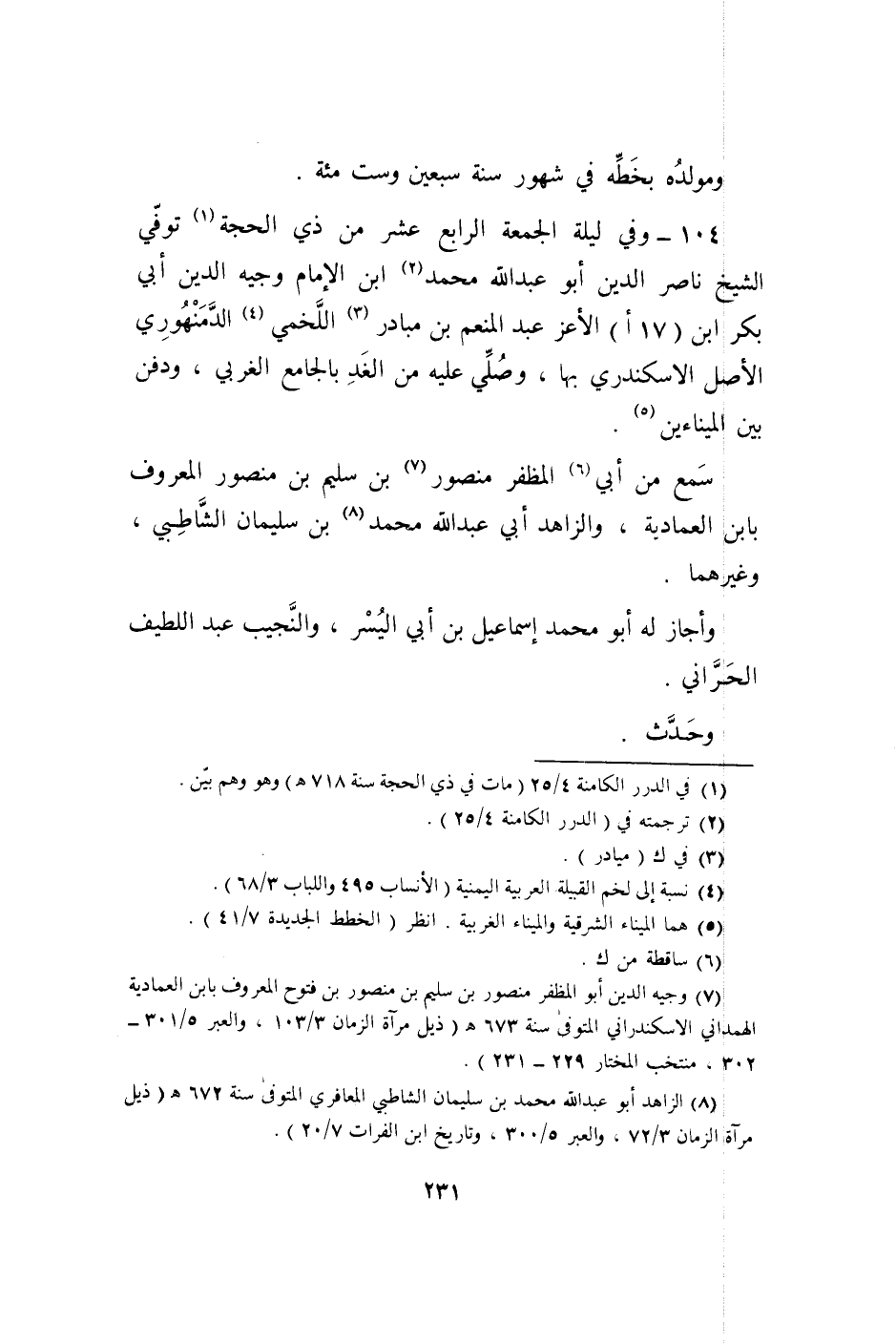 104 - وَفِي لَيْلَة الجمة الرَّابِع عشر من ذِي الْحجَّة توفّي الشَّيْخ نَاصِر الدّين أَبُو عبد الله مُحَمَّد ابْن الإِمَام وجيه الدّين أبي بكر ابْن (17 أ) الْأَعَز عبد الْمُنعم بن مبادر اللَّخْمِيّ الدمنهوري الأَصْل الاسكندري بهَا وَصلي عَلَيْهِ من الْغَد بالجامع الغربي وَدفن بَين الميناءين