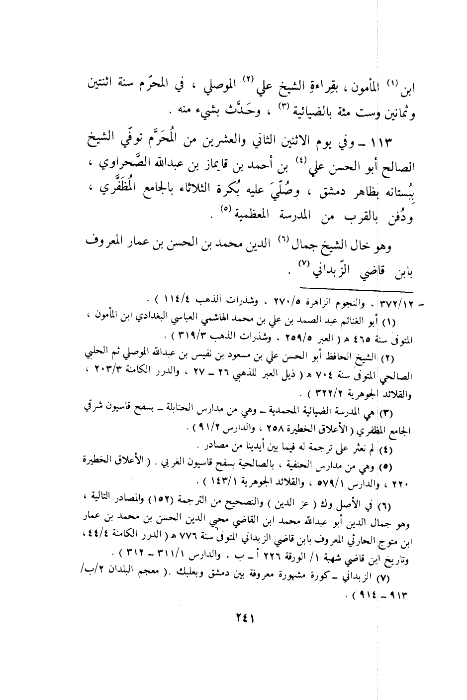 113 - وَفِي يَوْم الِاثْنَيْنِ الثَّانِي وَالْعِشْرين من الْمحرم توفّي الشَّيْخ الصَّالح أَبُو الْحسن عَليّ بن أَحْمد بن قايماز بن عبد الله الصحراوي ببستانه بِظَاهِر دمشق وَصلي عَلَيْهِ بكرَة الثُّلَاثَاء بالجامع المظفري وَدفن بِالْقربِ من الْمدرسَة المعظمية