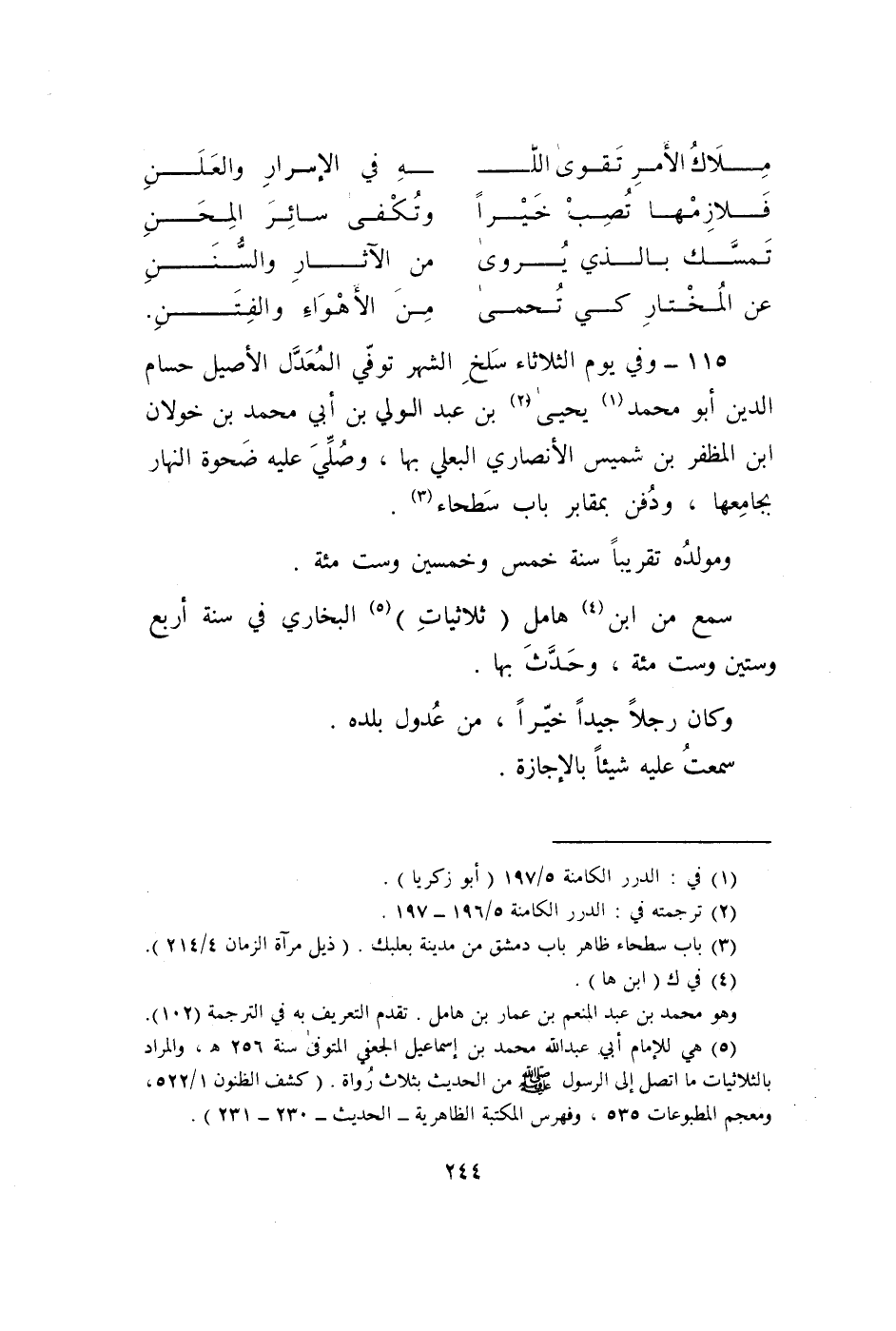 115 - وَفِي يَوْم الثُّلَاثَاء سلخ الشَّهْر توفّي الْمعدل الْأَصِيل حسام الدّين أَبُو مُحَمَّد يحيى بن عبد الْوَلِيّ بن أبي مُحَمَّد بن خولان ابْن المظفر بن شميس الْأنْصَارِيّ البعلي بهَا وَصلي عَلَيْهِ ضحوة النَّهَار بجامعها وَدفن بمقابر بَاب سطحاء
