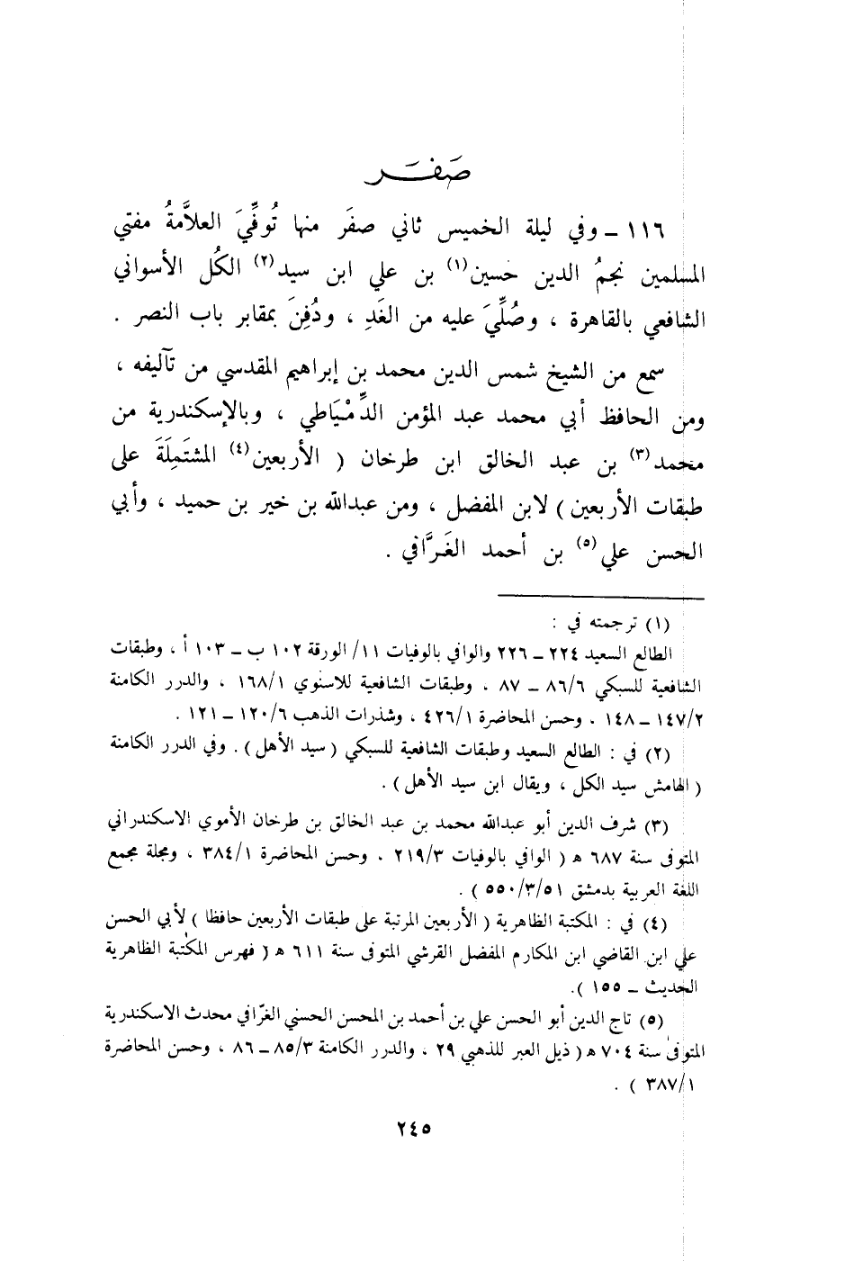 صفر 3 116 وَفِي لَيْلَة الْخَمِيس ثَانِي صفر مِنْهَا توفّي الْعَلامَة مفتي الْمُسلمين نجم الدّين حُسَيْن بن عَليّ ابْن سيد