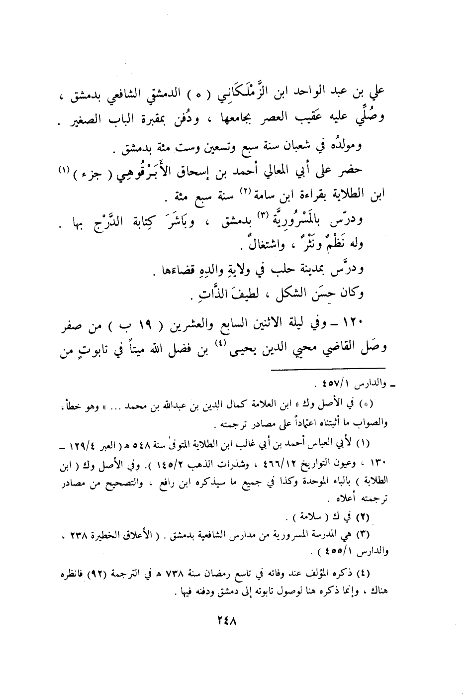 120 - وَفِي لَيْلَة الِاثْنَيْنِ السَّابِع وَالْعِشْرين 19 ب من صفر وصل القَاضِي محيي الدّين يحيى ابْن فضل الله مَيتا فِي تَابُوت من الْقَاهِرَة إِلَى دمشق وَدفن بتربة عِنْد اليغمورية وَكَانَ مَوته فِي تَاسِع رَمَضَان سنة ثَمَان وَثَلَاثِينَ