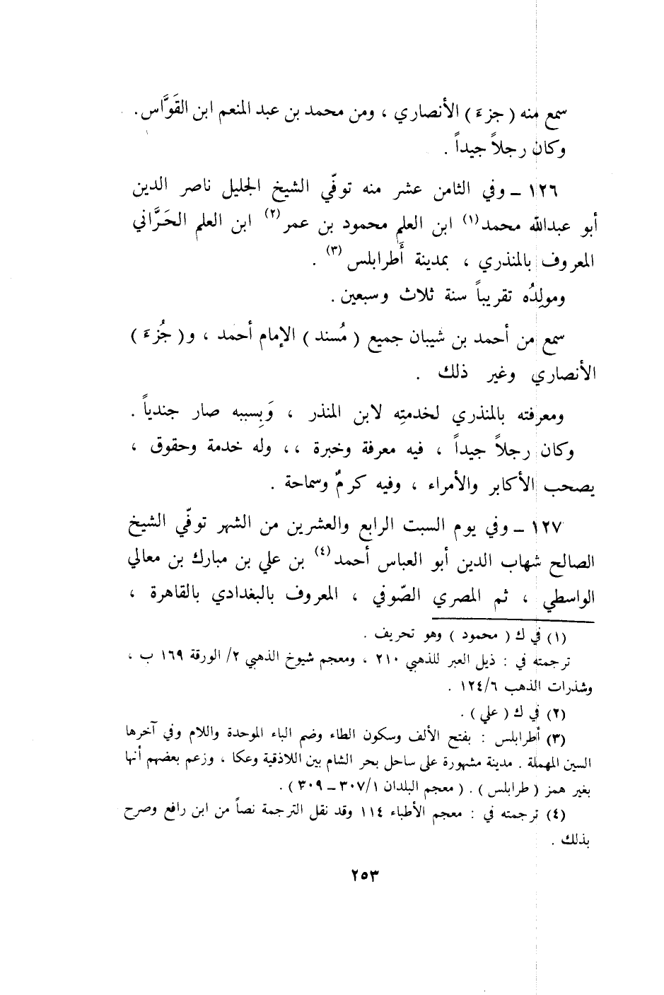126 - وَفِي الثَّامِن عشر مِنْهُ توفّي الشَّيْخ الْجَلِيل نَاصِر الدّين أَبُو عبد الله مُحَمَّد ابْن الْعلم مَحْمُود بن عمر ابْن الْعلم الْحَرَّانِي الْمَعْرُوف بالمنذري بِمَدِينَة أطرابلس