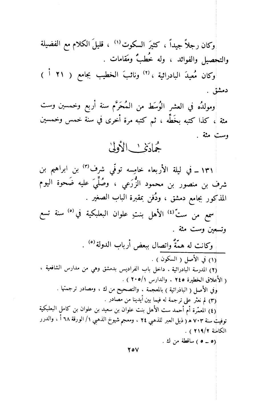 131 - فِي لَيْلَة الْأَرْبَعَاء خامسه توفّي شرف بن إِبْرَاهِيم بن شرف بن مَنْصُور بن مَحْمُود الزرعي وَصلي عَلَيْهِ ضحوة الْيَوْم الْمَذْكُور بِجَامِع دمشق وَدفن بمقبرة الْبَاب الصَّغِير